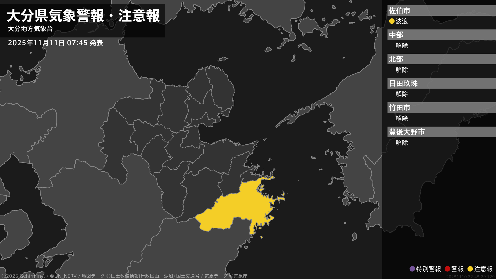 【大分県 気象警報・注意報 2025年11月11日 07:45】南部では、11日昼前まで高波に注意してください。#気象警報注意報 #大分県