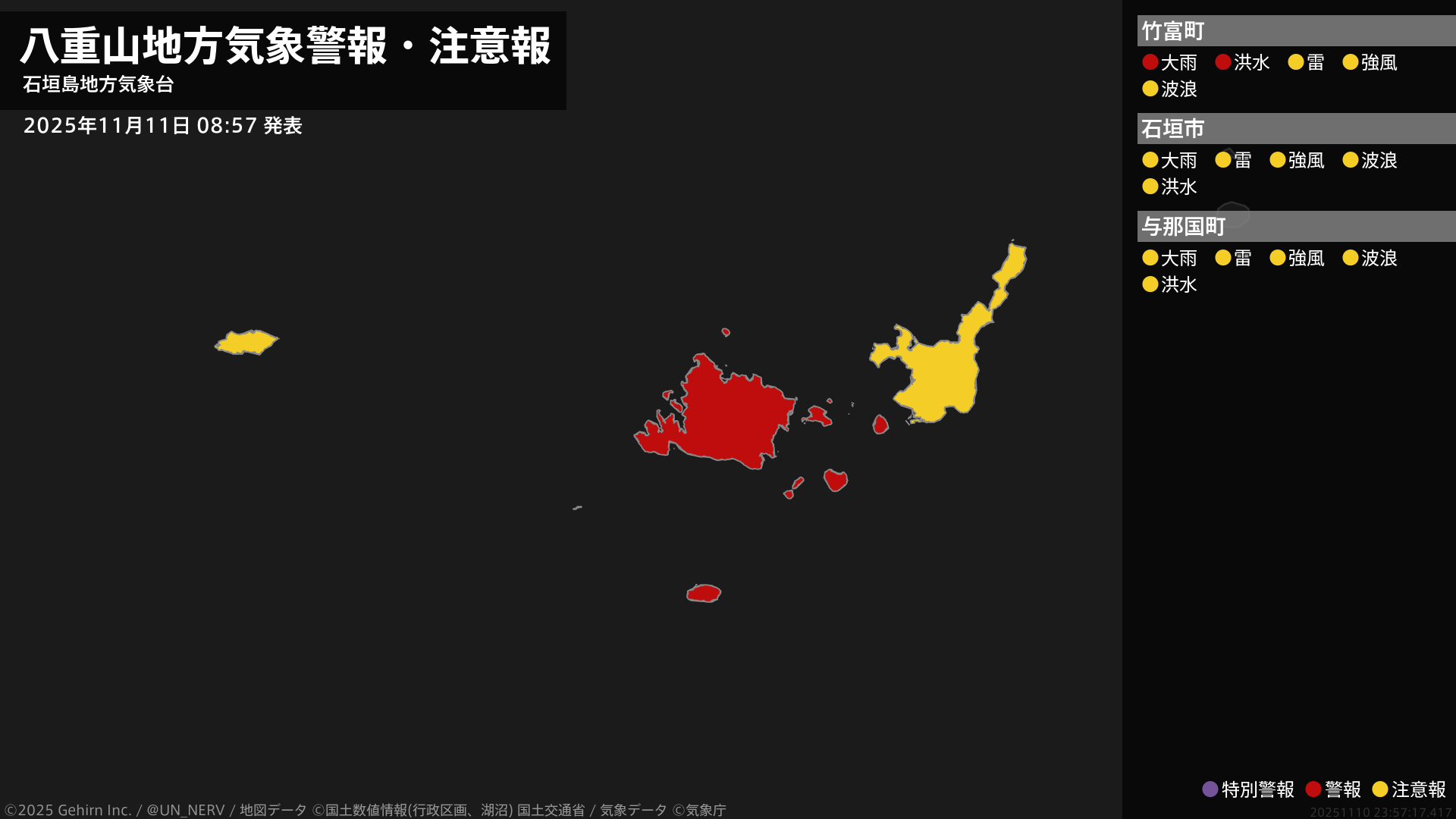 【八重山地方 気象警報・注意報 2025年11月11日 08:57】石垣島地方では、11日昼過ぎまで低い土地の浸水や河川の増水に警戒してください。#気象警報注意報 #八重山地方