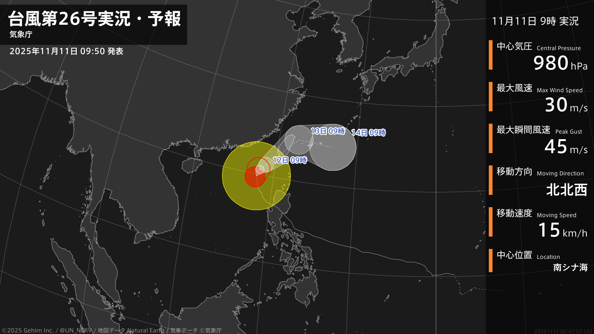 【台風第26号実況・予報 2025年11月11日 09:47】台風第26号(フォンウォン)は、南シナ海を1時間に15キロの速さで北北西に進んでいます。#台風情報