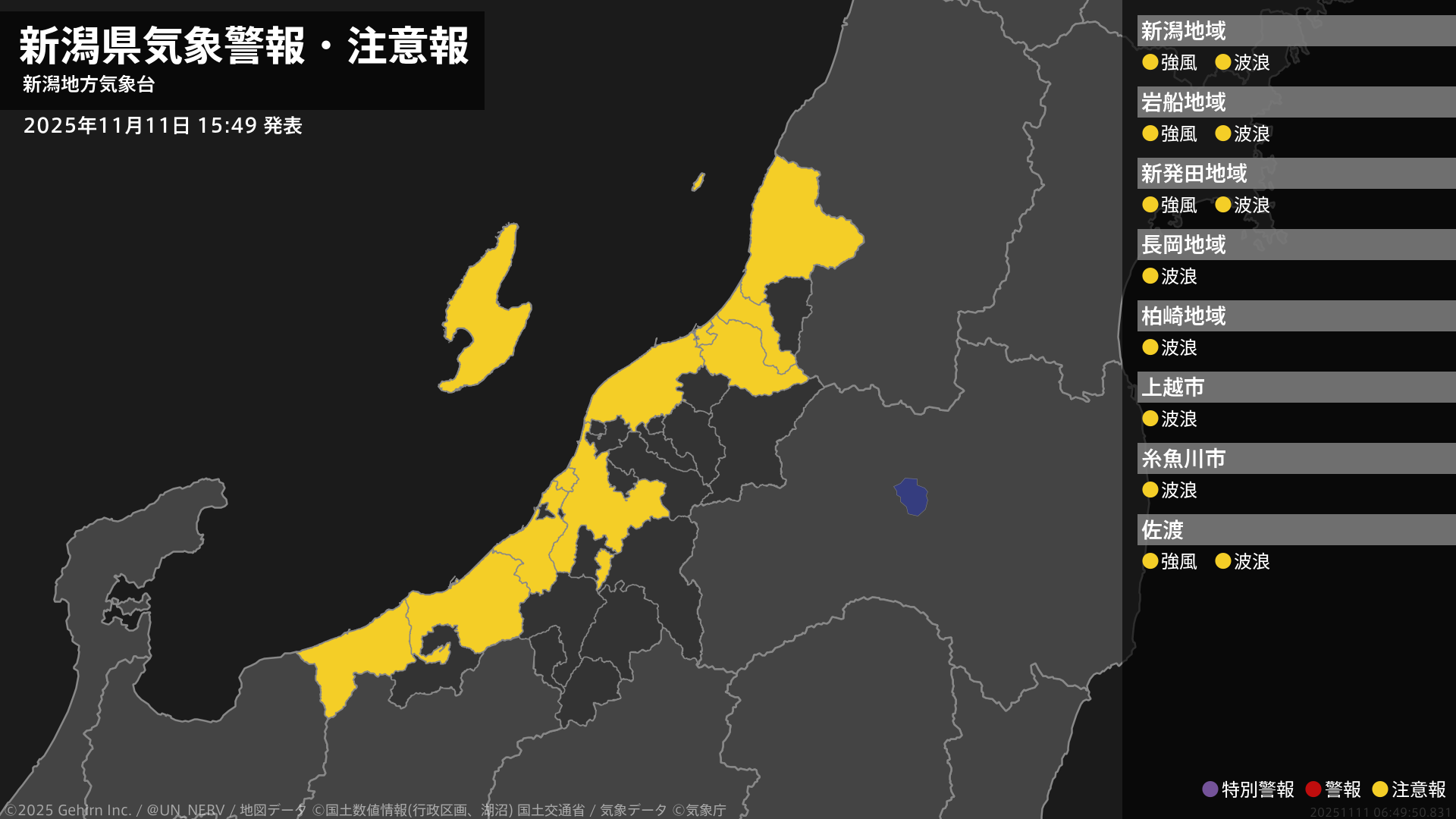 【新潟県 気象警報・注意報 2025年11月11日 15:49】