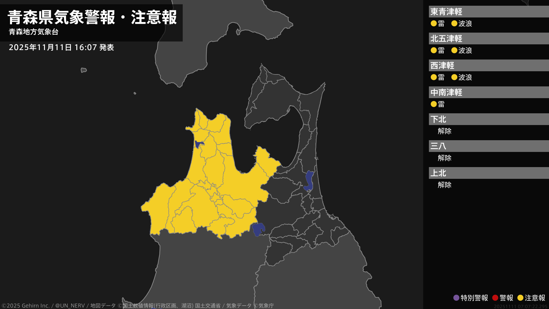 【青森県 気象警報・注意報 2025年11月11日 16:07】