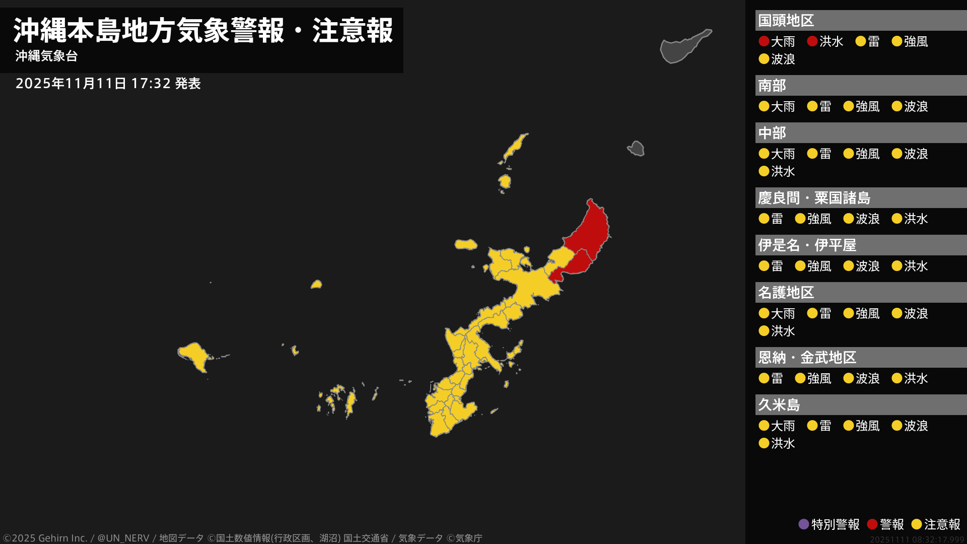 【沖縄本島地方 気象警報・注意報 2025年11月11日 17:32】