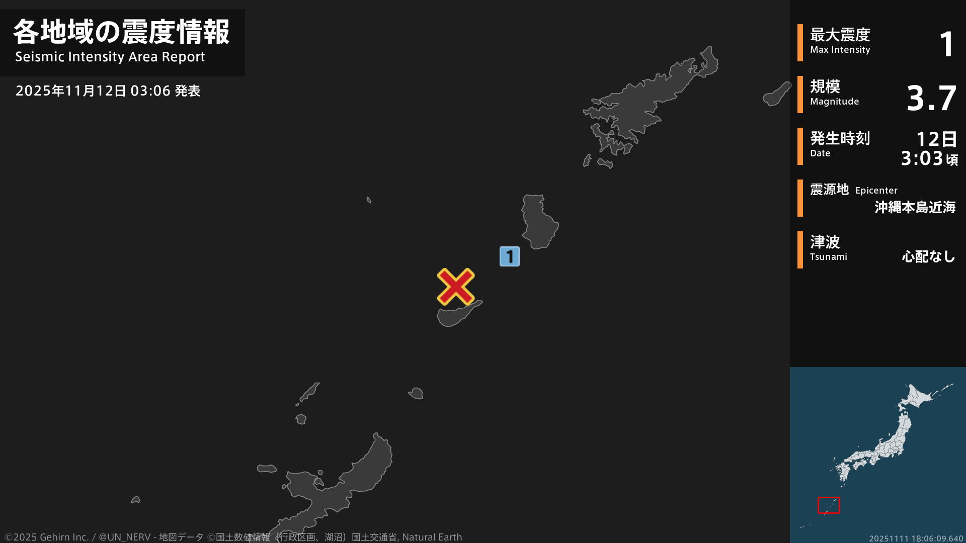 【地震情報 2025年11月12日】3時3分頃、沖縄本島近海を震源とする地震がありました。震源の深さは約40km、地震の規模はM3.7、最大震度1を鹿児島県で観測しています。この地震による津波の心配はありません。#地震 #鹿児島県