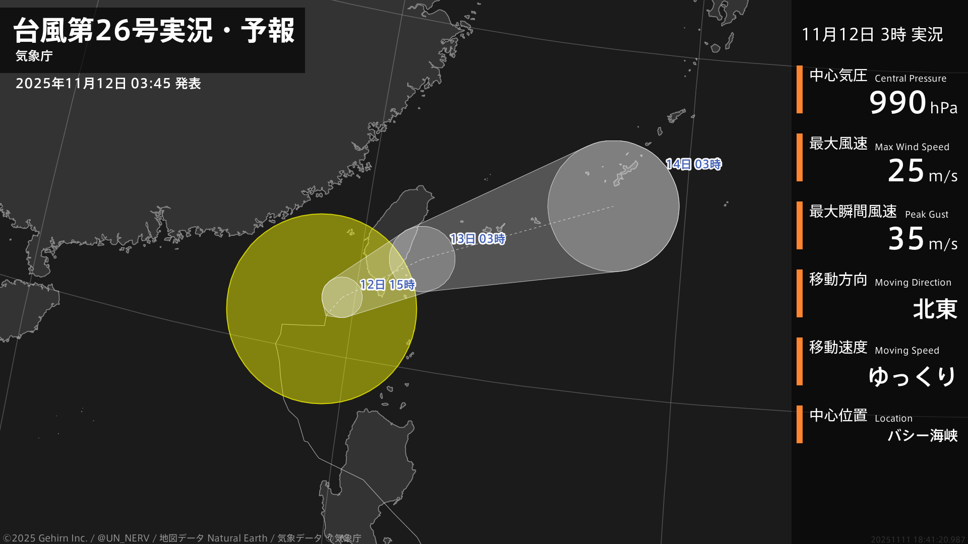 【台風第26号実況・予報 2025年11月12日 03:41】台風第26号(フォンウォン)は、バシー海峡をゆっくりと北東に進んでいます。#台風情報