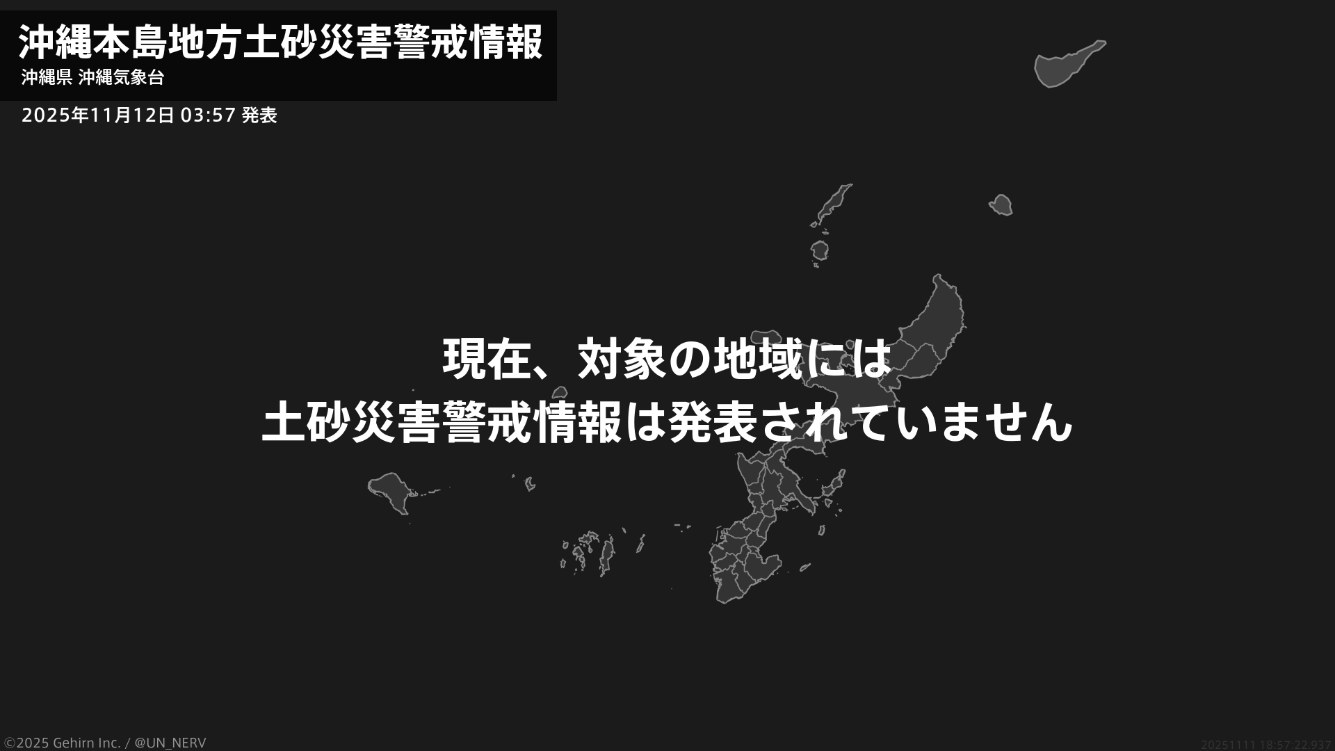 【沖縄本島地方 土砂災害警戒情報 2025年11月12日 03:57】沖縄本島地方に発表されていた土砂災害警戒情報はすべて解除されました。#土砂災害警戒情報 #沖縄本島地方