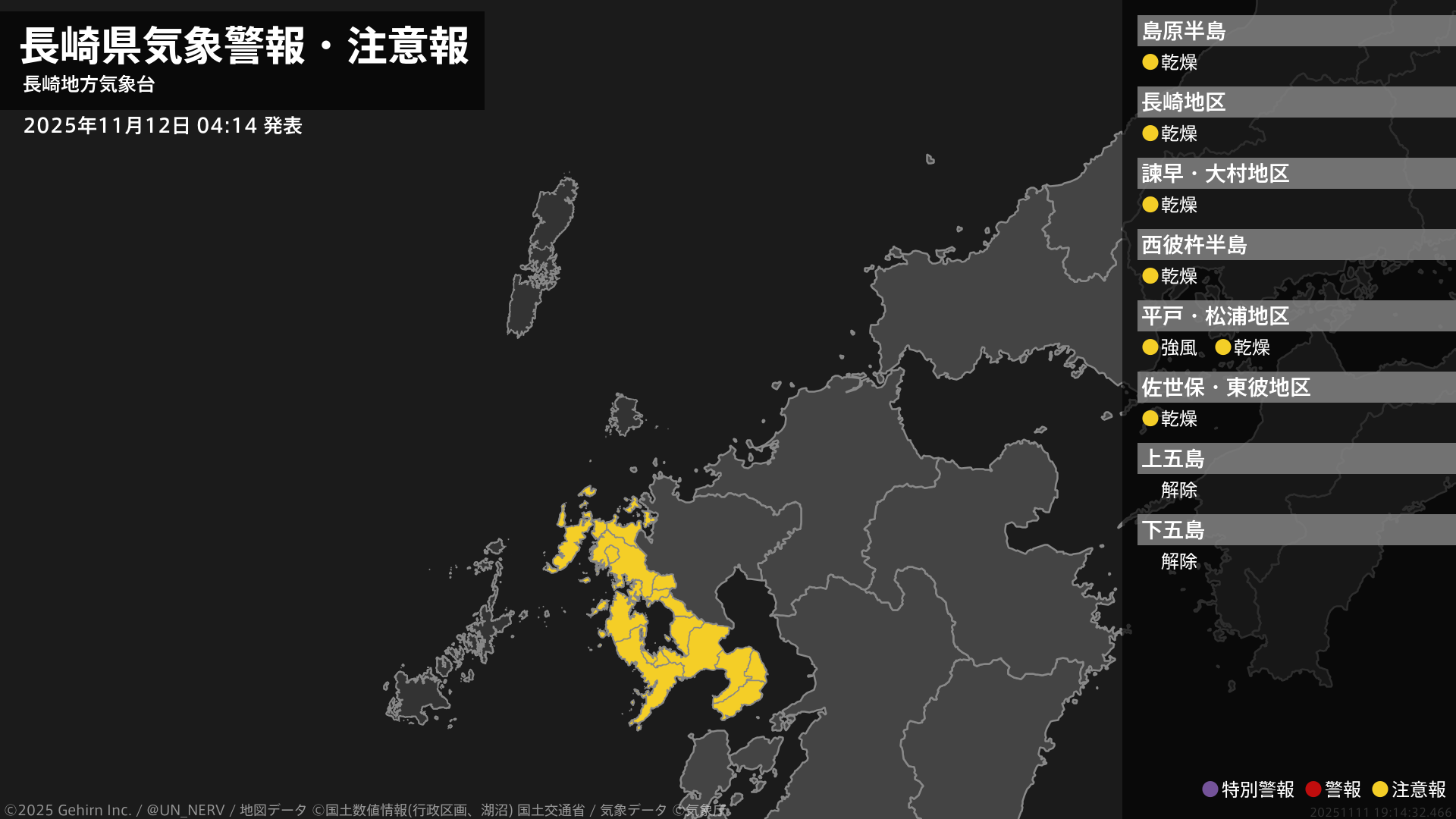 【長崎県 気象警報・注意報 2025年11月12日 04:14】北部では、12日昼前まで強風に注意してください。南部、北部では、12日まで空気の乾燥した状態が続くため、火の取り扱いに注意してください。#気象警報注意報 #長崎県