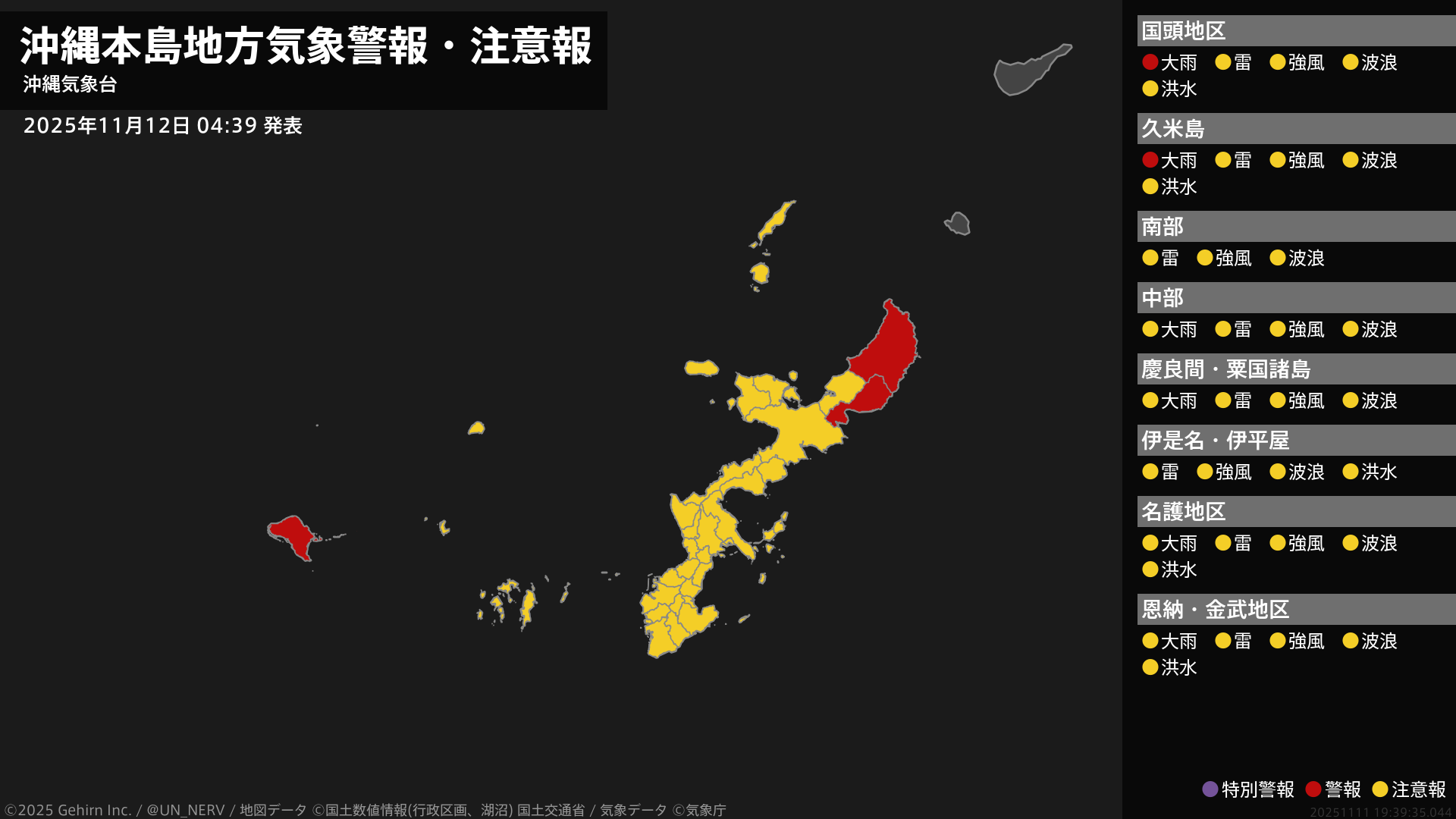 沖縄地方では12日は、土砂災害、低い土地の浸水に警戒し、河川の増水に注意・警戒してください。13日はうねりを伴う高波に警戒し、暴風に注意・警戒してください。また、落雷や竜巻などの激しい突風に注意してください。