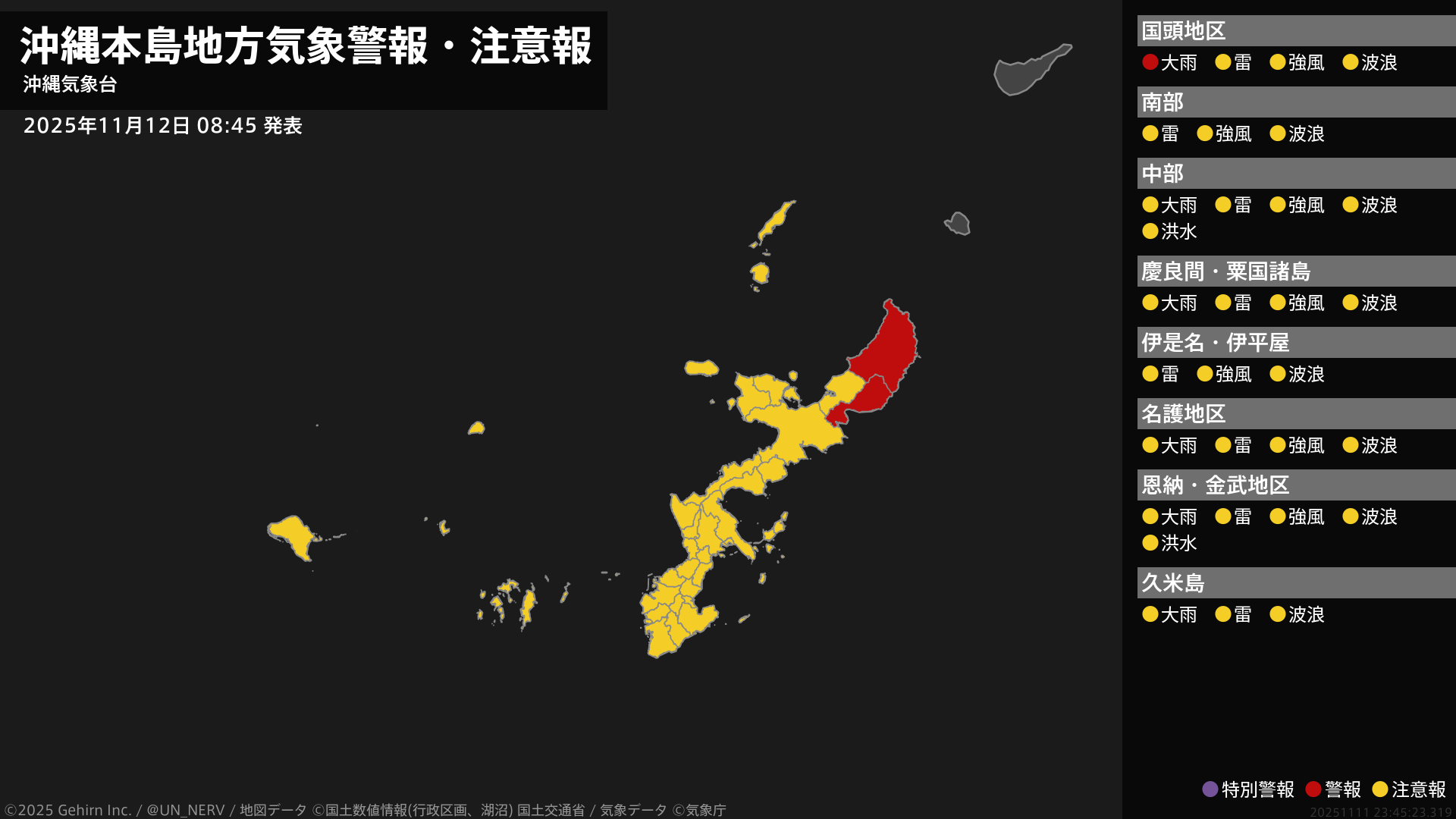【沖縄本島地方 気象警報・注意報 2025年11月12日 08:45】