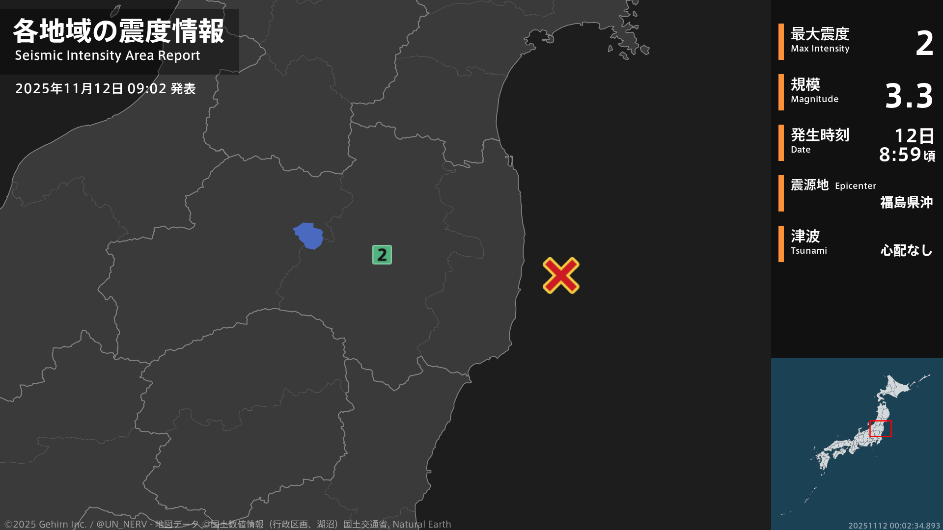 8時59分頃、福島県沖を震源とする地震がありました。震源の深さは約60km、地震の規模はM3.3、最大震度2を福島県で観測しています。この地震による津波の心配はありません。