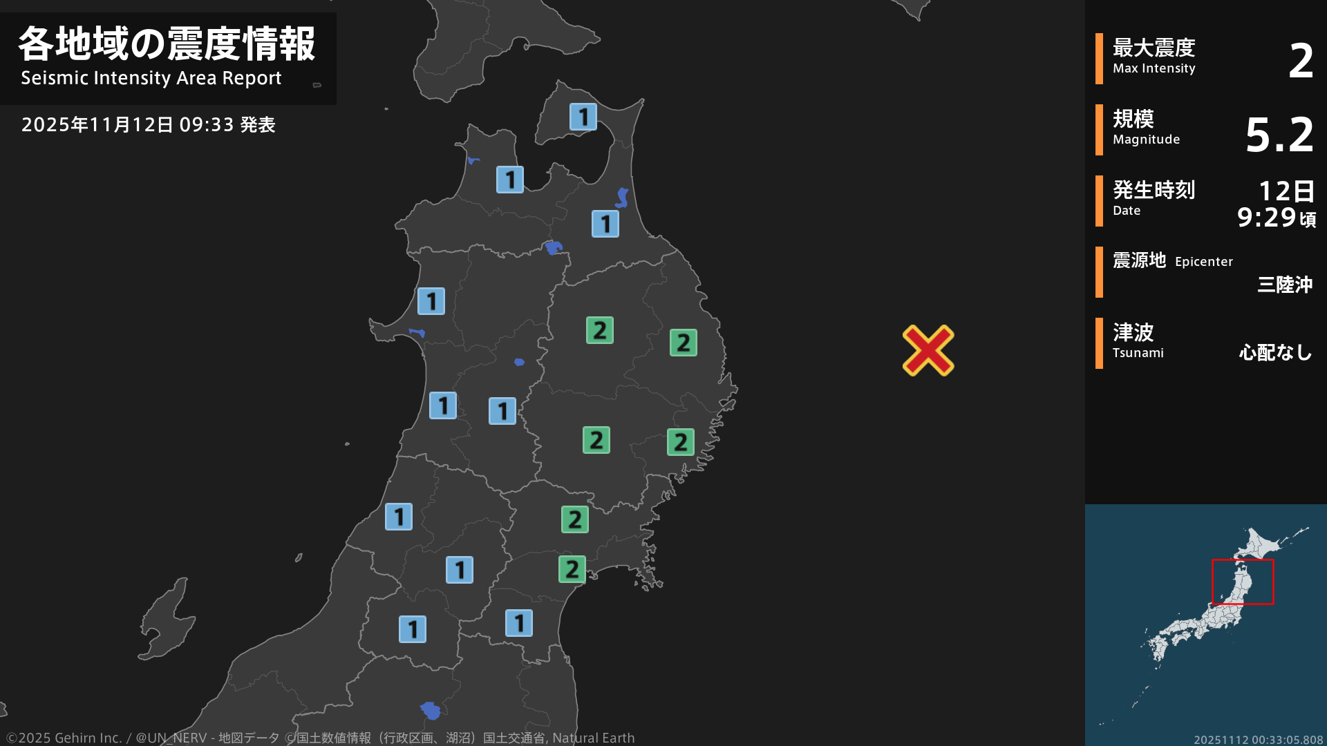 9時29分頃、三陸沖を震源とする地震がありました。震源の深さは約10km、地震の規模はM5.2、最大震度2を岩手県、宮城県で観測しています。この地震による津波の心配はありません。