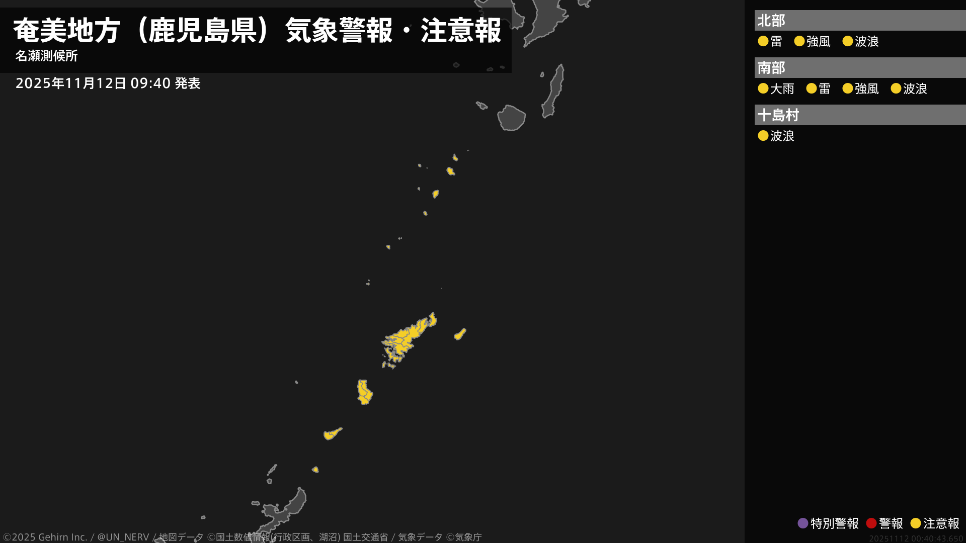 【奄美地方(鹿児島県) 気象警報・注意報 2025年11月12日 09:40】
