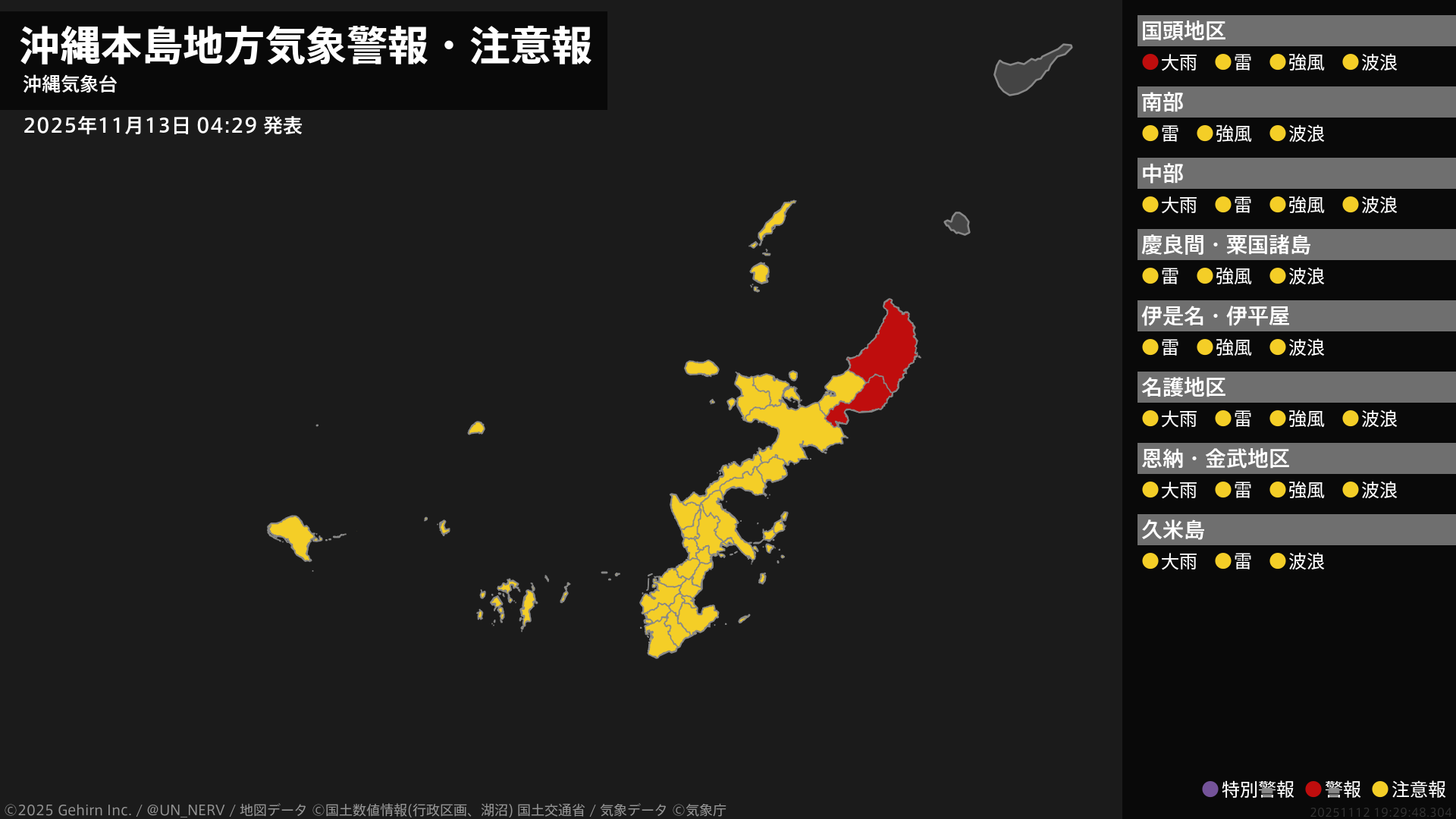 沖縄地方・奄美地方では14日にかけて、土砂災害に厳重に警戒し、低い土地の浸水、河川の増水や氾濫に警戒してください。沖縄地方では13日はうねりを伴う高波に警戒し、強風に注意・警戒してください。また、沖縄地方・奄美地方では13日は落雷や竜巻などの激しい突風に注意してください。