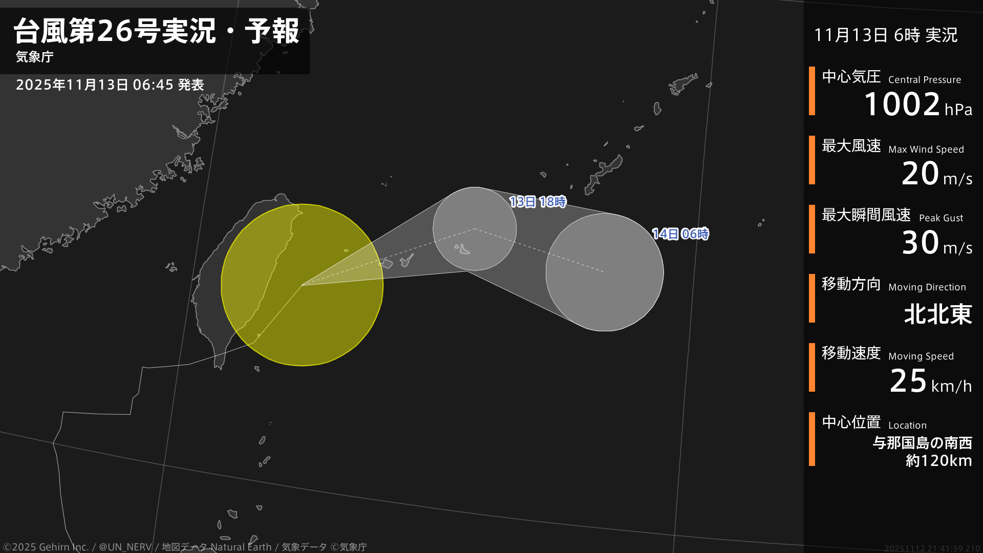 【台風第26号実況・予報 2025年11月13日 06:41】台風第26号(フォンウォン)は、与那国島の南西約120kmを1時間に25キロの速さで北北東に進んでいます。#台風情報