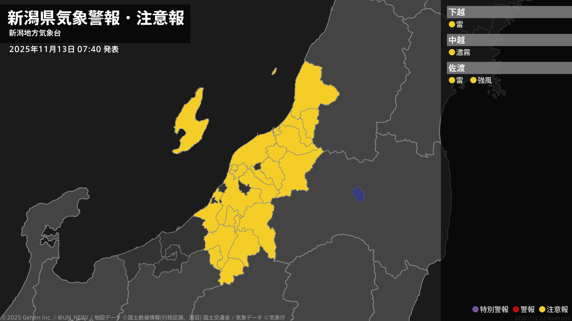 【新潟県 気象警報・注意報 2025年11月13日 07:40】佐渡では、強風に注意してください。下越、佐渡では、急な強い雨や落雷に注意してください。中越では、濃霧による視程障害に注意してください。#気象警報注意報 #新潟県