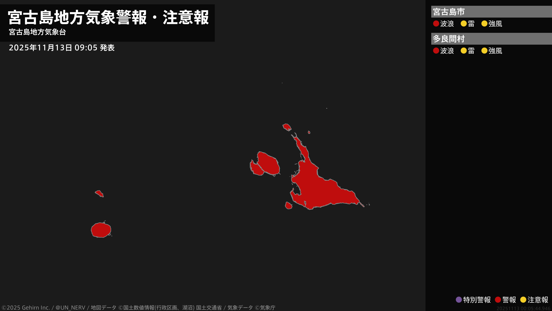 【宮古島地方 気象警報・注意報 2025年11月13日 09:05】宮古島地方では、13日夕方から13日夜遅くまで高波に警戒してください。#気象警報注意報 #宮古島地方