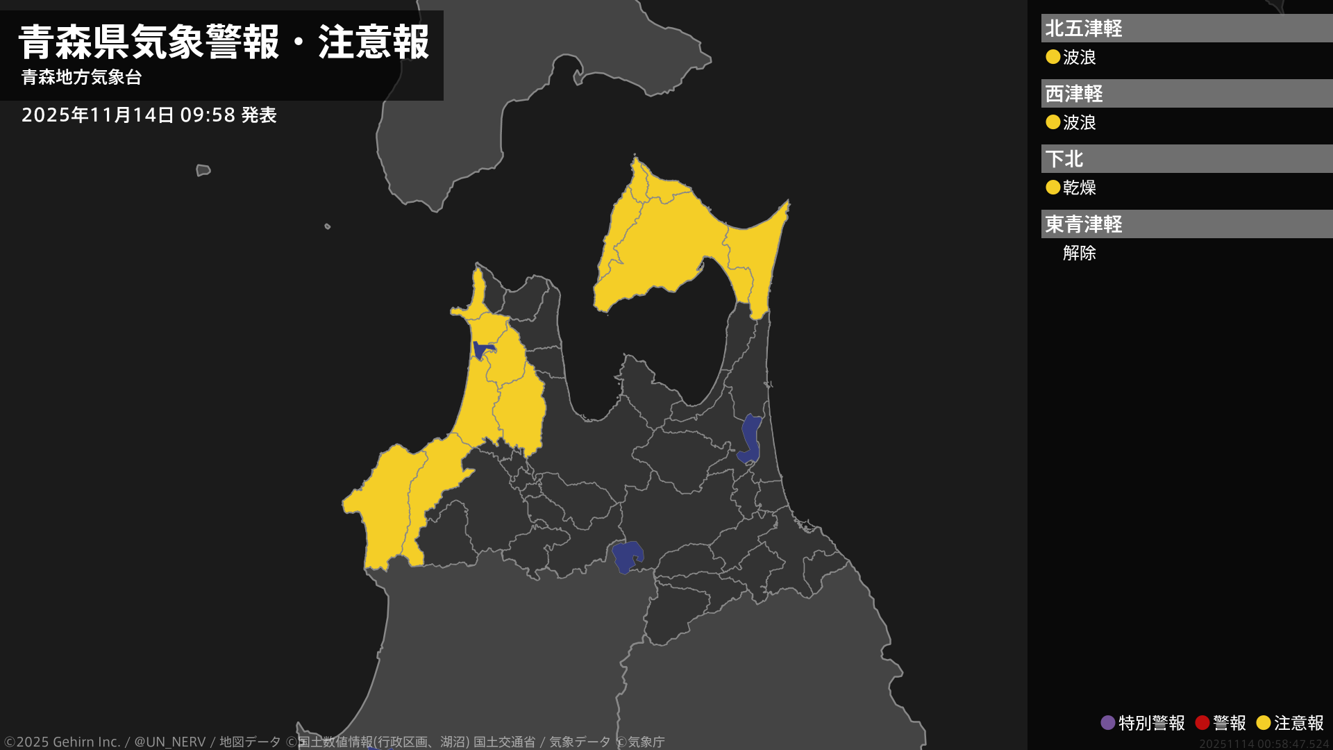 【青森県 気象警報・注意報 2025年11月14日 09:58】津軽では、14日昼過ぎまで高波に注意してください。下北では、14日まで空気の乾燥した状態が続くため、火の取り扱いに注意してください。#気象警報注意報 #青森県