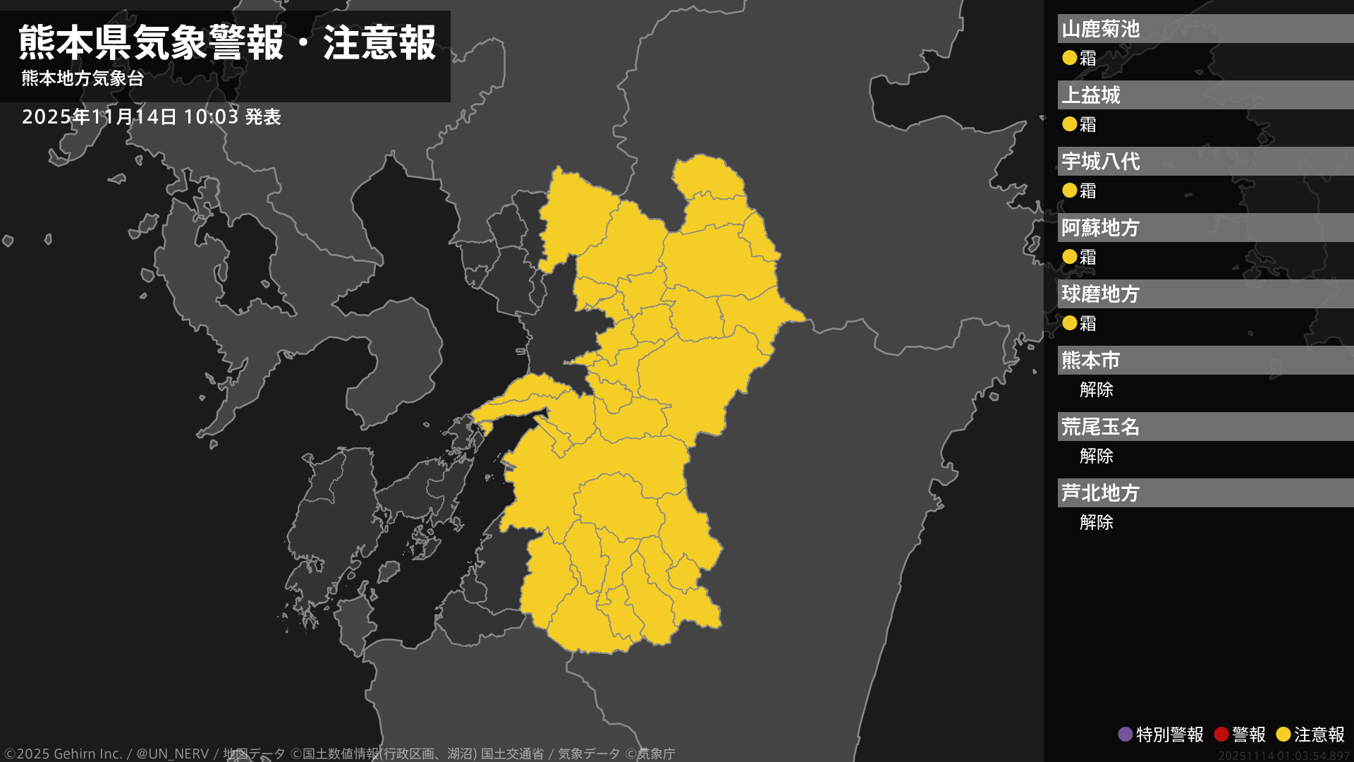 【熊本県 気象警報・注意報 2025年11月14日 10:03】熊本、阿蘇、球磨地方では、15日朝は霜に対する農作物の管理に注意してください。#気象警報注意報 #熊本県