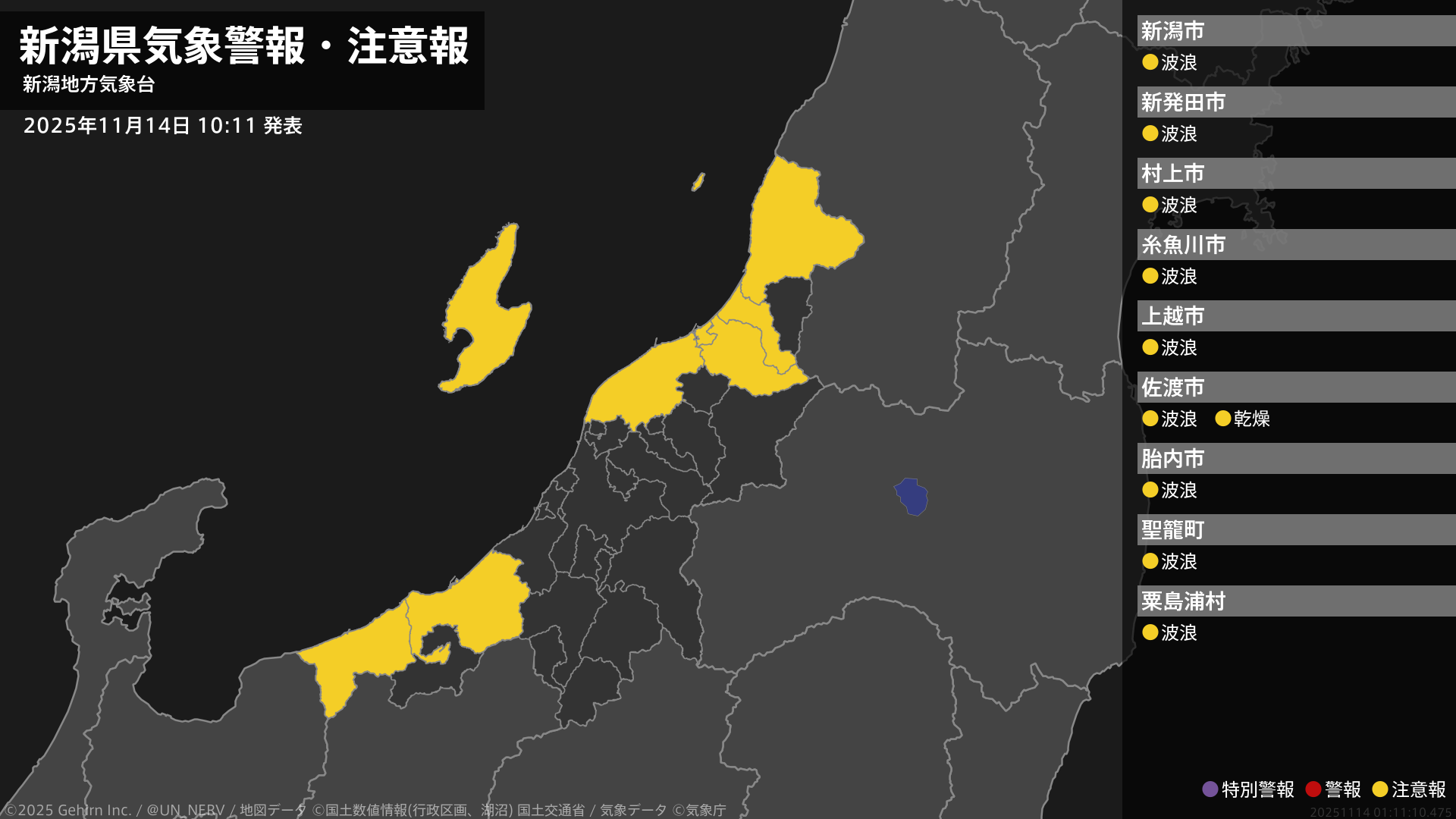 【新潟県 気象警報・注意報 2025年11月14日 10:11】下越、上越、佐渡では、14日夕方まで高波に注意してください。佐渡では、14日まで空気の乾燥した状態が続くため、火の取り扱いに注意してください。#気象警報注意報 #新潟県