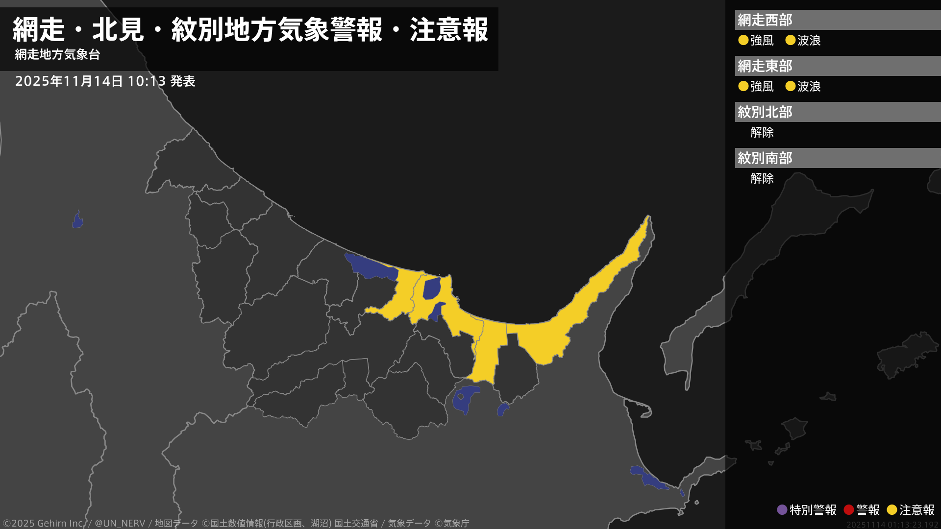 【網走・北見・紋別地方 気象警報・注意報 2025年11月14日 10:13】網走地方では、14日夕方まで強風に、15日明け方まで高波に注意してください。#気象警報注意報 #網走・北見・紋別地方