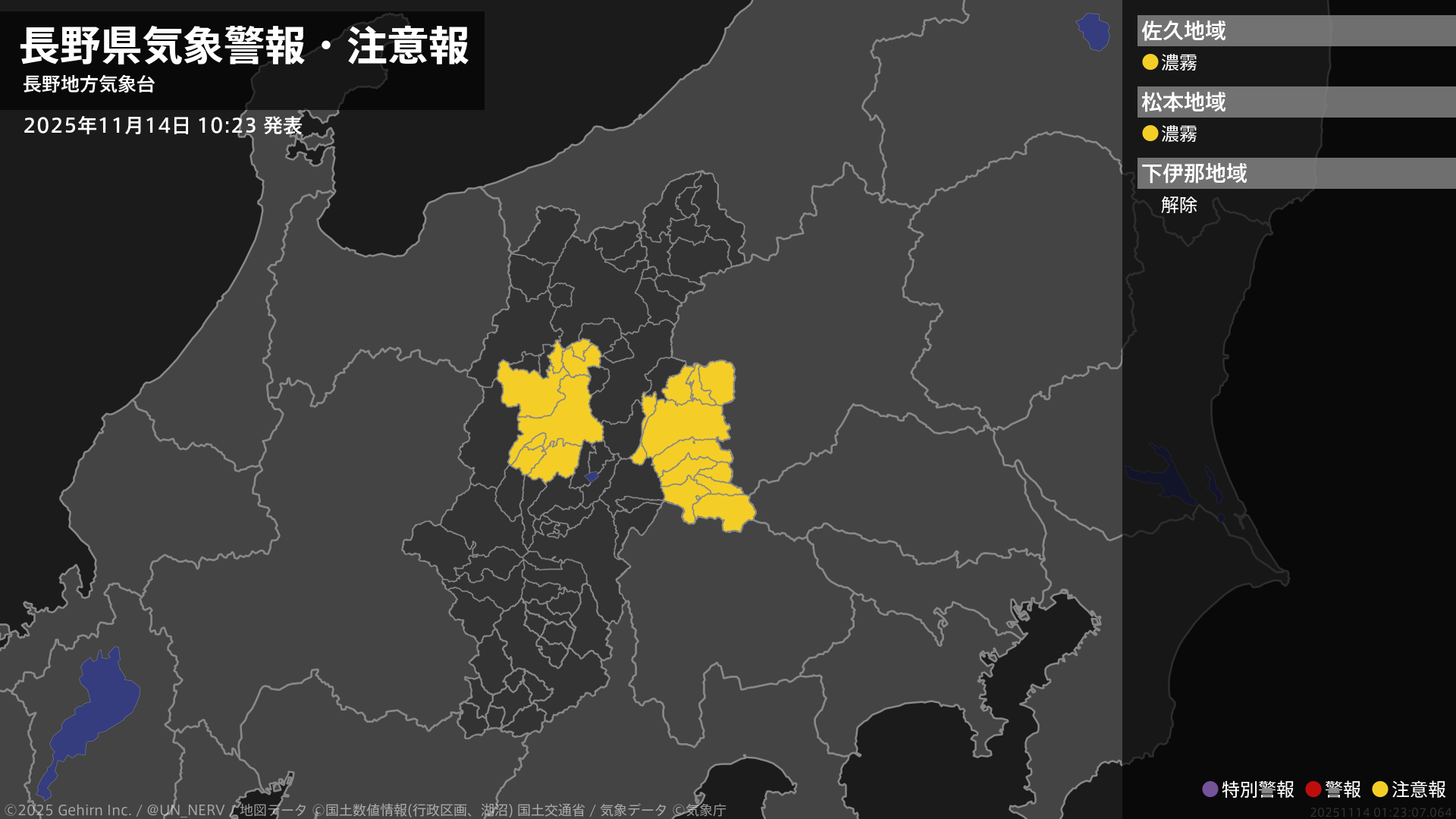 【長野県 気象警報・注意報 2025年11月14日 10:23】中部では、14日昼過ぎまで濃霧による視程障害に注意してください。#気象警報注意報 #長野県