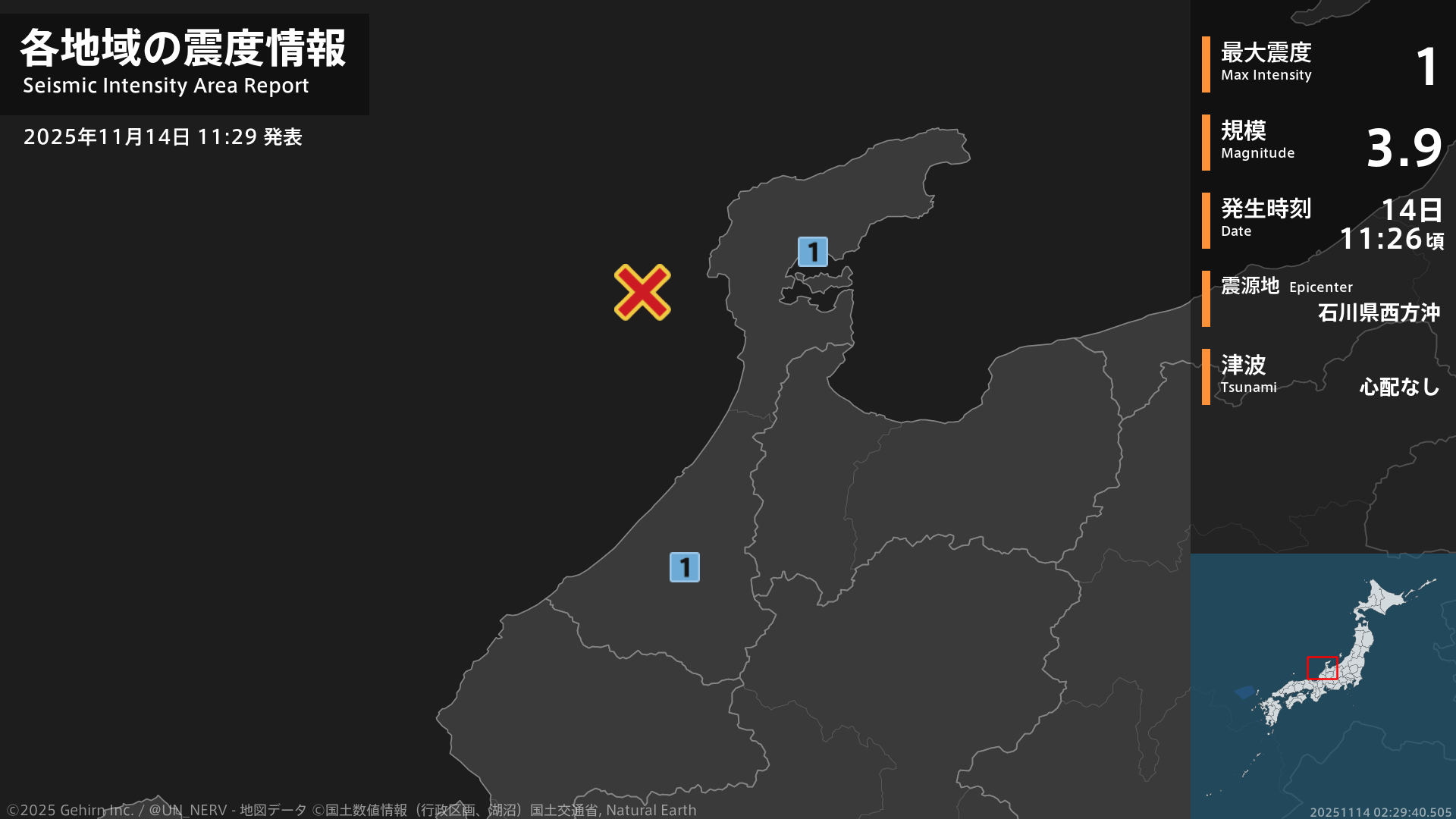 【地震情報 2025年11月14日】11時26分頃、石川県西方沖を震源とする地震がありました。震源の深さは約10km、地震の規模はM3.9、最大震度1を石川県で観測しています。この地震による津波の心配はありません。#地震 #石川県