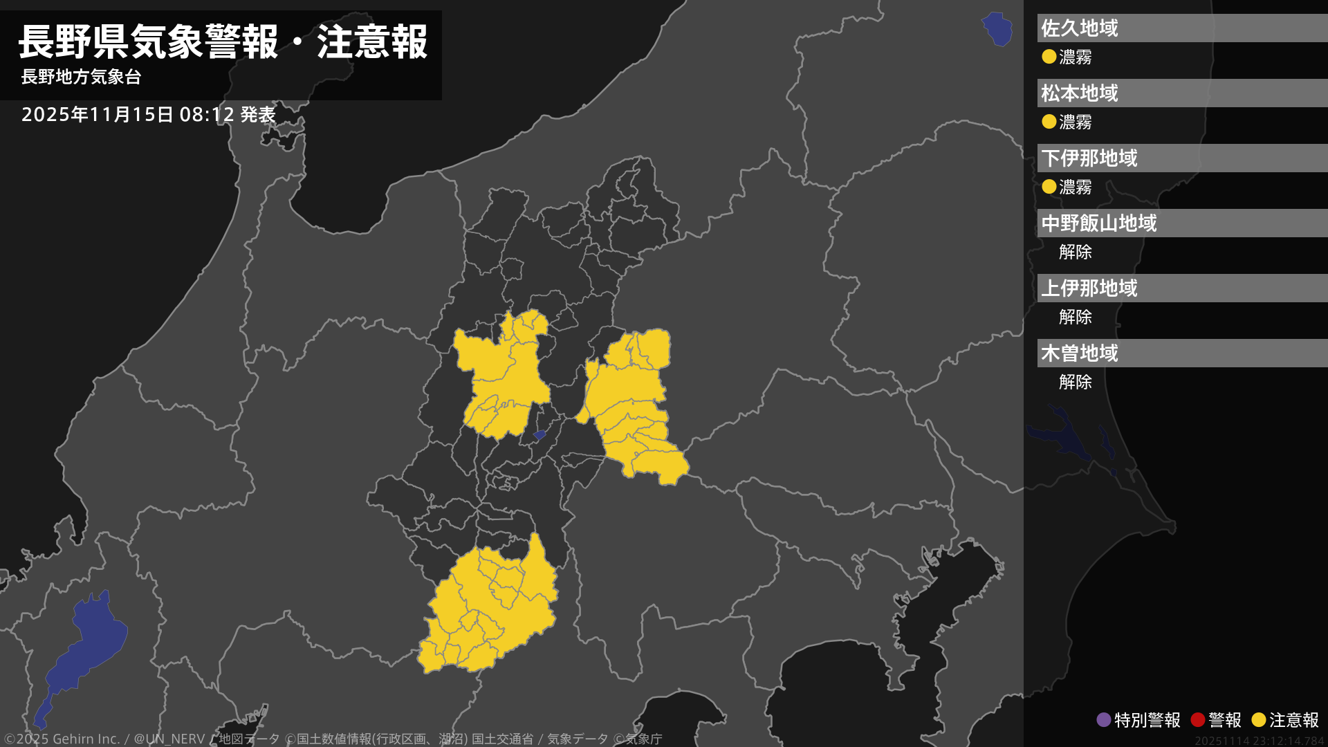 【長野県 気象警報・注意報 2025年11月15日 08:12】中部、南部では、15日昼前まで濃霧による視程障害に注意してください。#気象警報注意報 #長野県