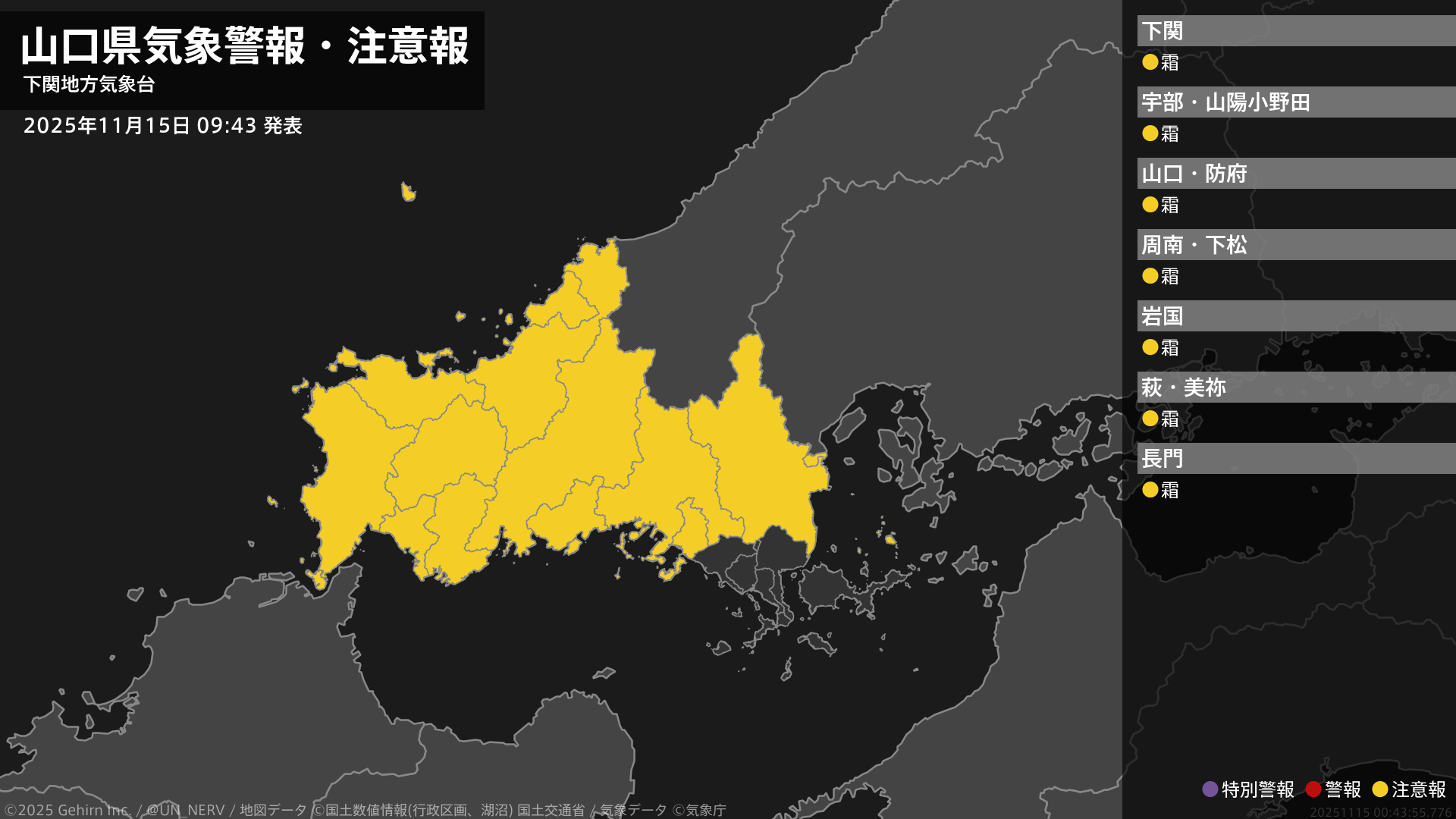 【山口県 気象警報・注意報 2025年11月15日 09:43】山口県では、16日朝は霜に対する農作物の管理に注意してください。#気象警報注意報 #山口県
