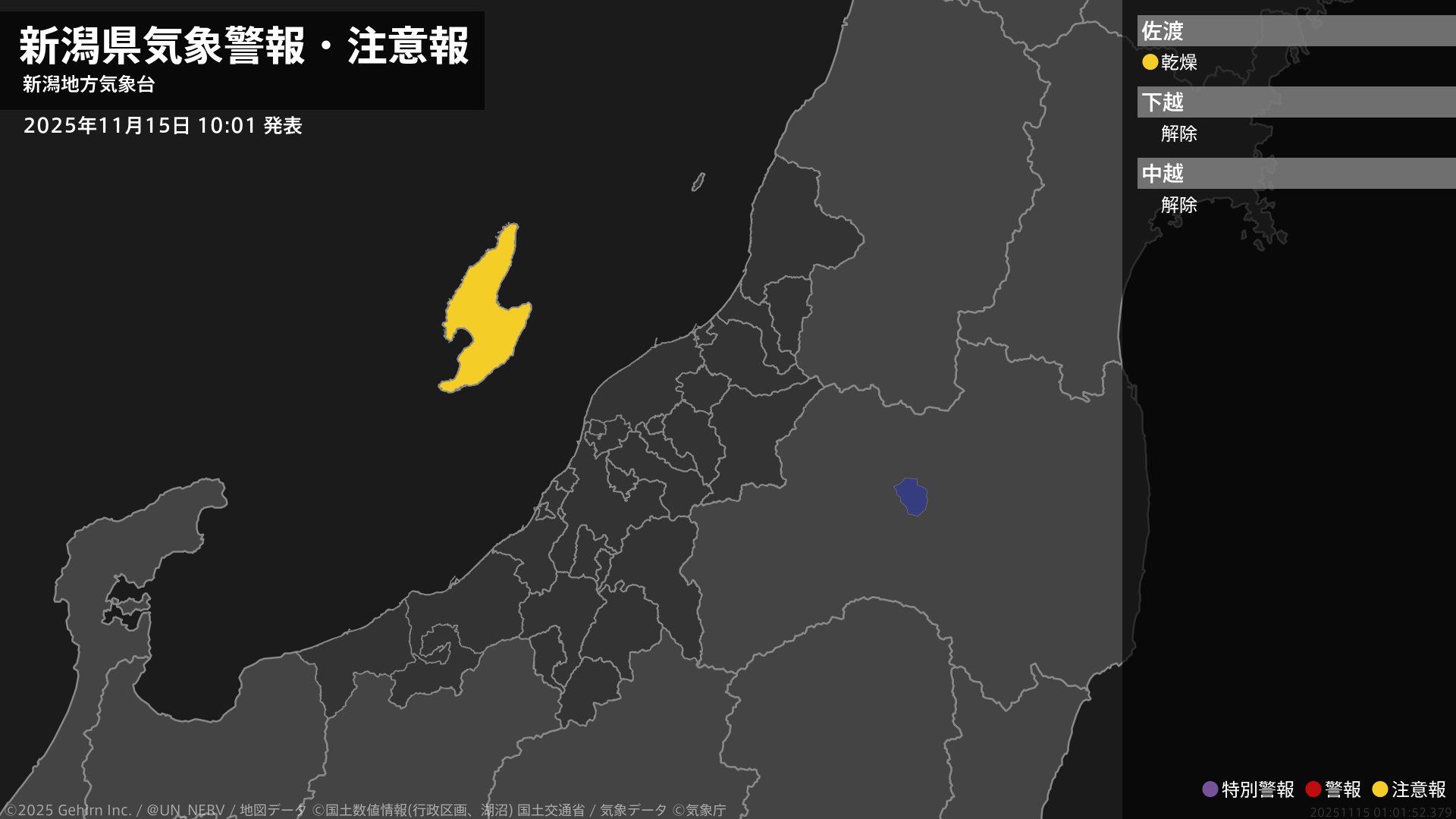 【新潟県 気象警報・注意報 2025年11月15日 10:01】佐渡では、16日まで空気の乾燥した状態が続くため、火の取り扱いに注意してください。#気象警報注意報 #新潟県
