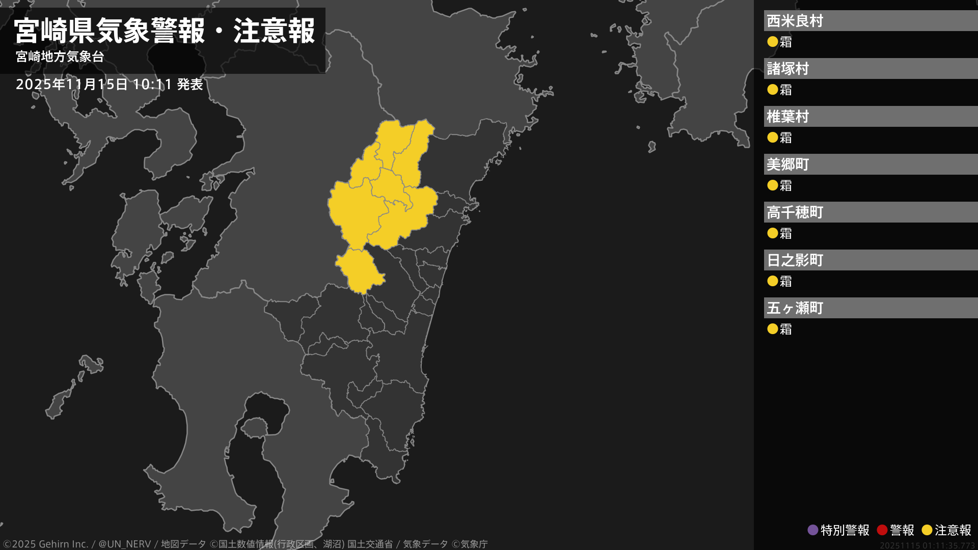 【宮崎県 気象警報・注意報 2025年11月15日 10:11】北部山沿いでは、16日朝は霜に対する農作物の管理に注意してください。#気象警報注意報 #宮崎県