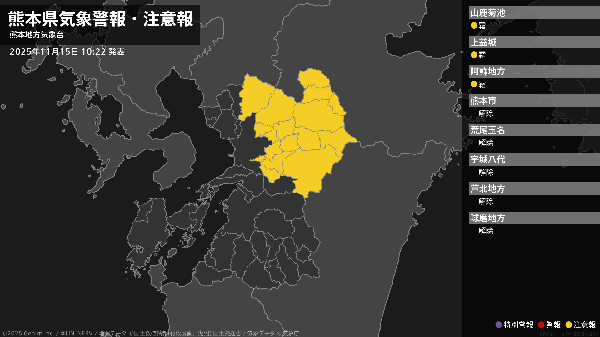 【熊本県 気象警報・注意報 2025年11月15日 10:22】熊本、阿蘇地方では、16日朝は霜に対する農作物の管理に注意してください。#気象警報注意報 #熊本県