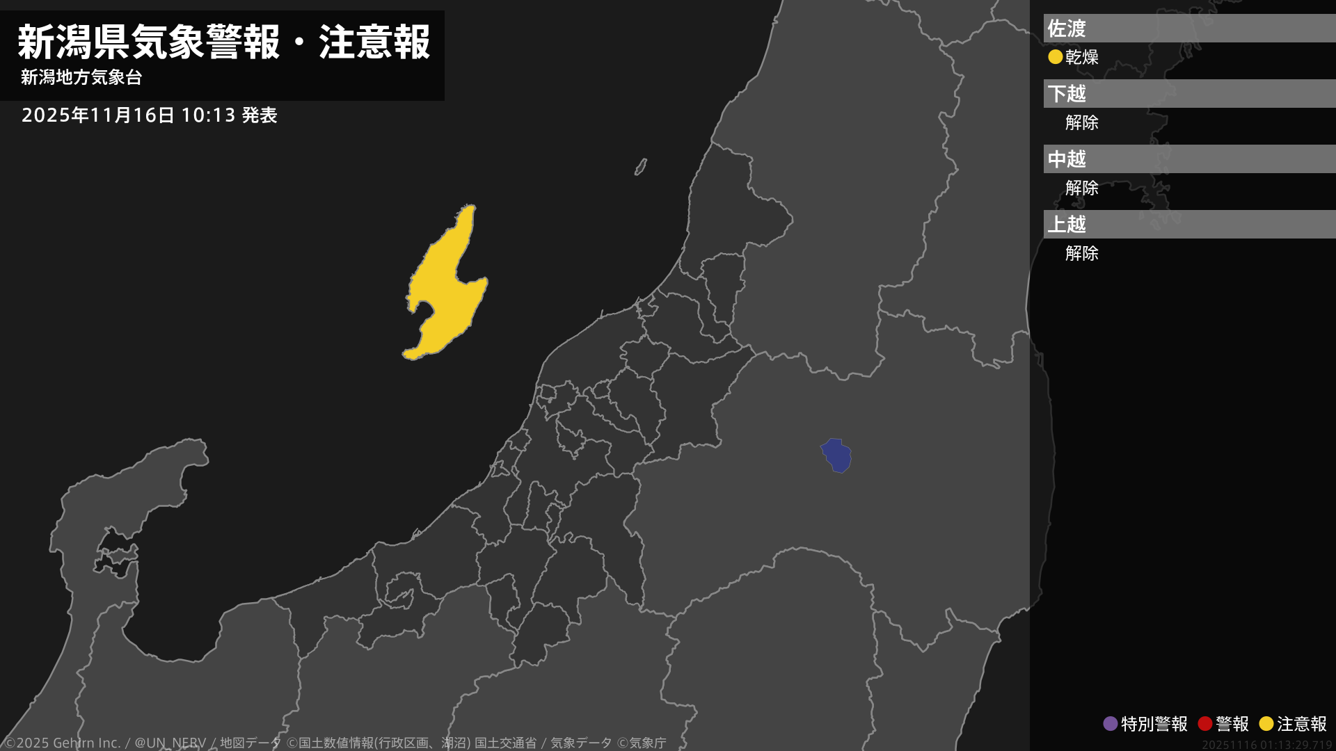 【新潟県 気象警報・注意報 2025年11月16日 10:13】佐渡では、16日まで空気の乾燥した状態が続くため、火の取り扱いに注意してください。#気象警報注意報 #新潟県