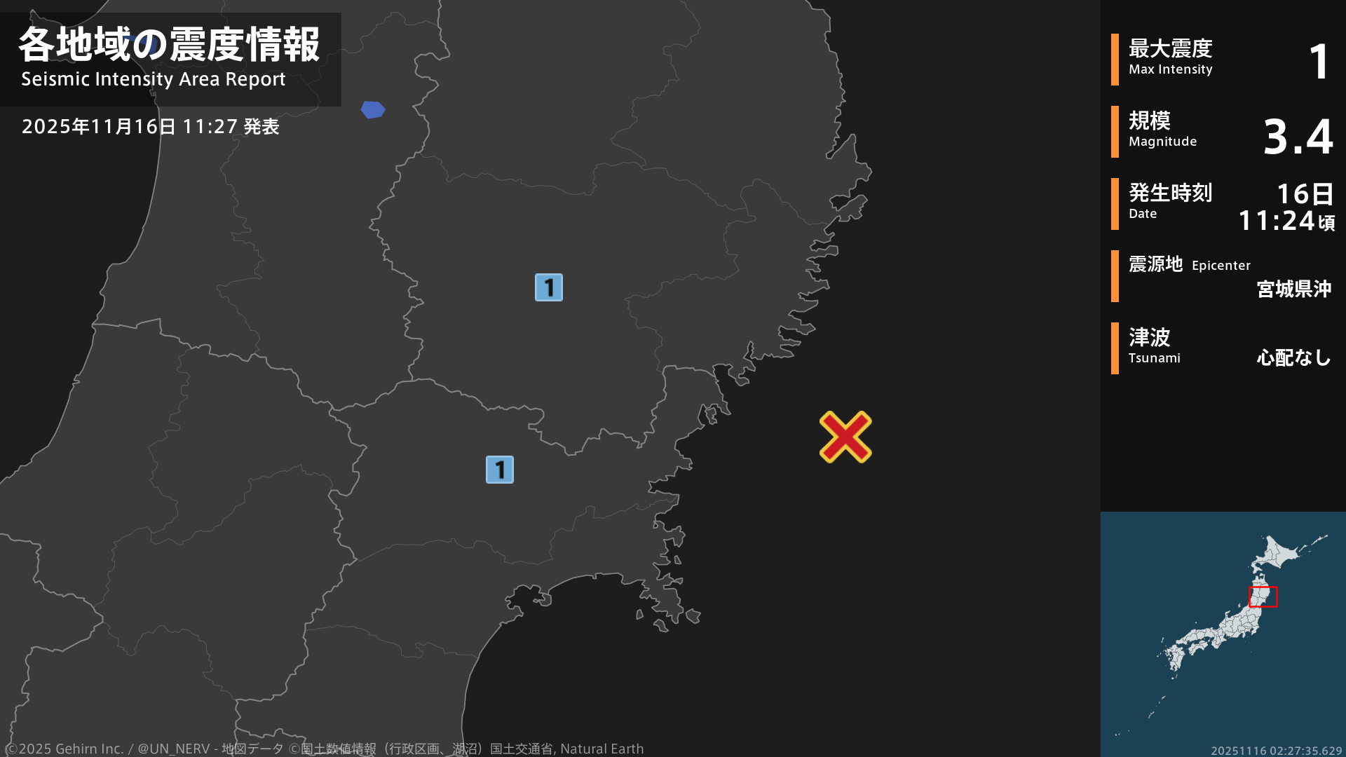 【地震情報 2025年11月16日】11時24分頃、宮城県沖を震源とする地震がありました。震源の深さは約50km、地震の規模はM3.4、最大震度1を岩手県、宮城県で観測しています。この地震による津波の心配はありません。#地震 #岩手県 #宮城県