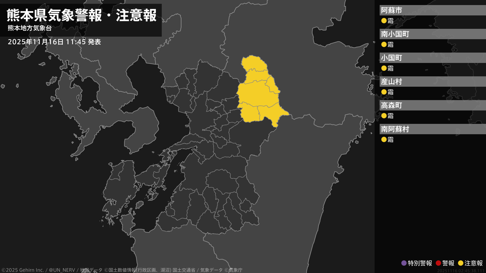 【熊本県 気象警報・注意報 2025年11月16日 11:45】阿蘇地方では、17日朝は霜に対する農作物の管理に注意してください。#気象警報注意報 #熊本県