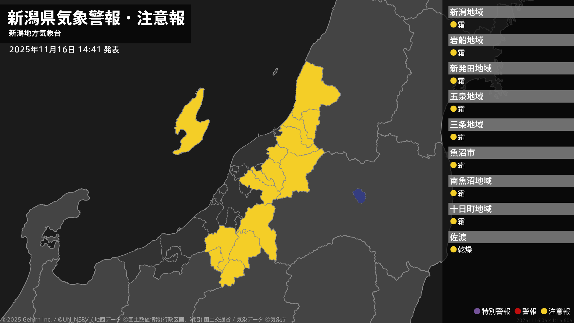 【新潟県 気象警報・注意報 2025年11月16日 14:41】佐渡では、16日まで空気の乾燥した状態が続くため、火の取り扱いに注意してください。下越、中越では、17日朝は霜に対する農作物の管理に注意してください。#気象警報注意報 #新潟県