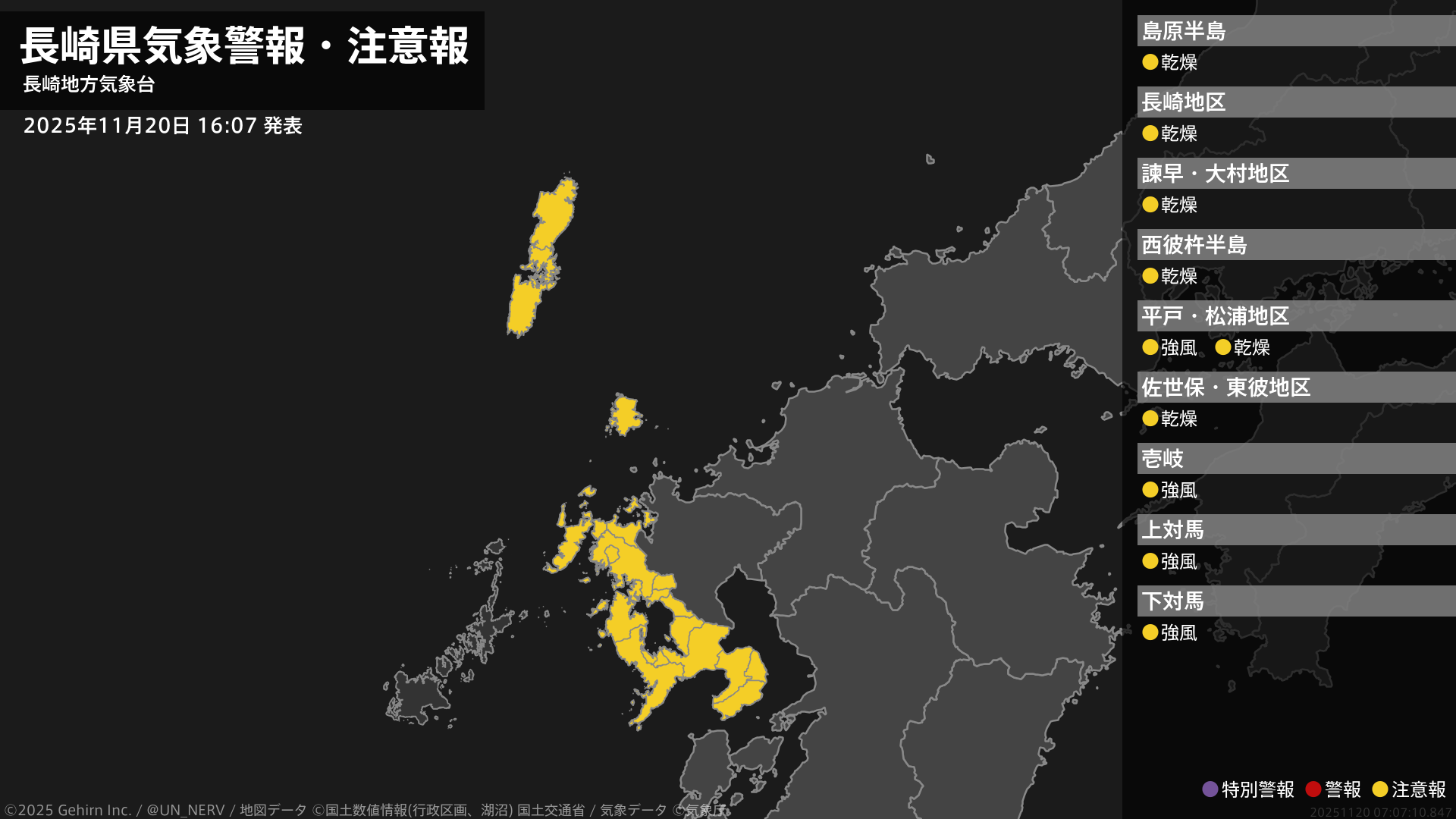 【長崎県 気象警報・注意報 2025年11月20日 16:07】北部、壱岐・対馬では、強風に注意してください。南部、北部では、空気の乾燥した状態が続くため、火の取り扱いに注意してください。#気象警報注意報 #長崎県