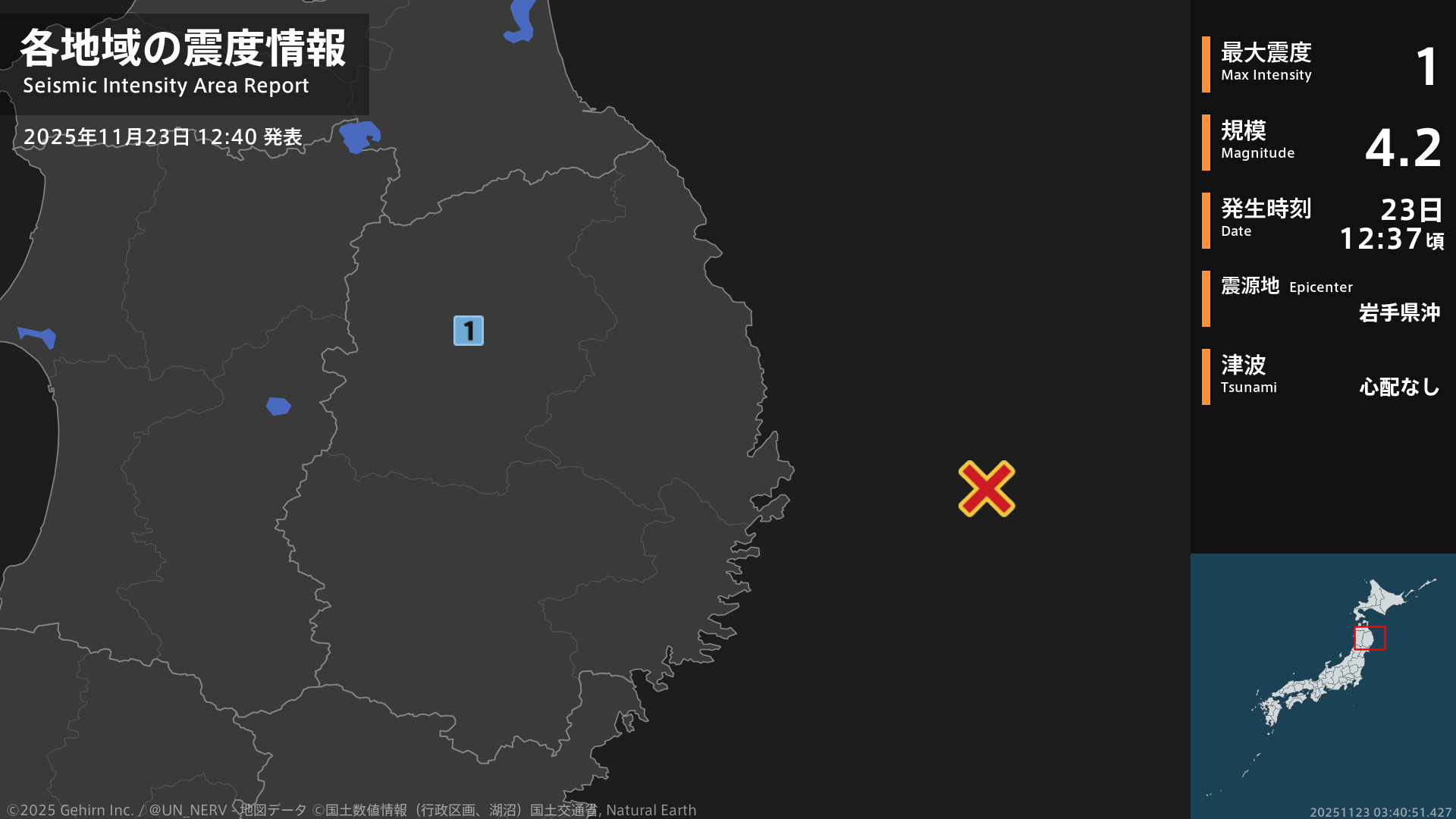 【地震情報 2025年11月23日】12時37分頃、岩手県沖を震源とする地震がありました。震源の深さは約30km、地震の規模はM4.2、最大震度1を岩手県で観測しています。この地震による津波の心配はありません。#地震 #岩手県