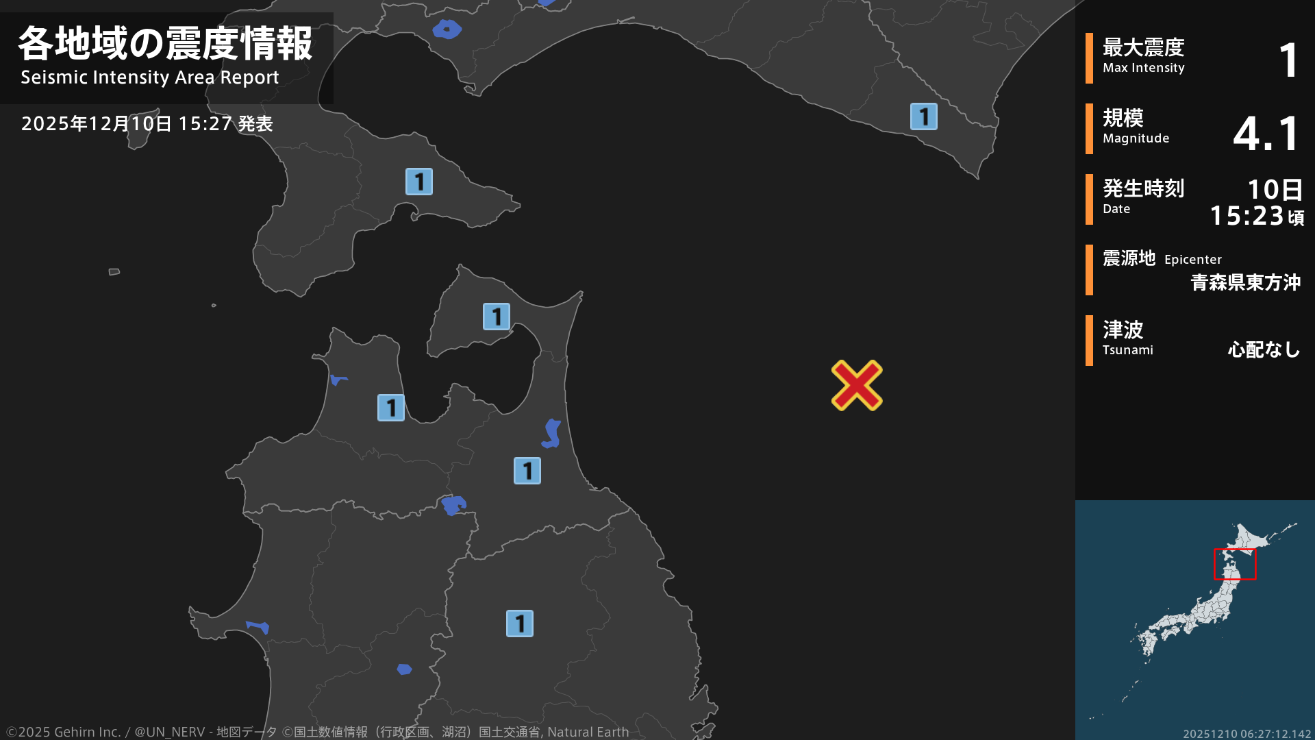 【地震情報 2025年12月10日】15時23分頃、青森県東方沖を震源とする地震がありました。震源の深さは約30km、地震の規模はM4.1、最大震度1を北海道、青森県、岩手県で観測しています。この地震による津波の心配はありません。#地震 #北海道 #青森県 #岩手県
