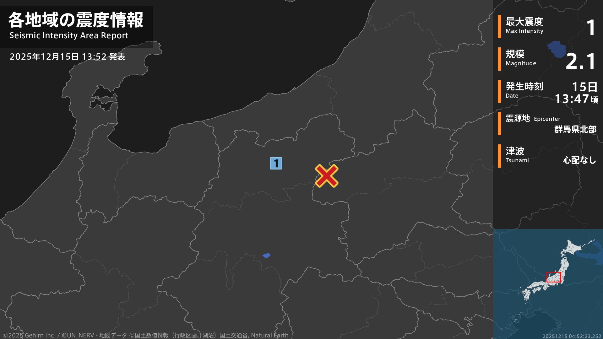 【地震情報 2025年12月15日】13時47分頃、群馬県北部を震源とする地震がありました。震源の深さは約10km、地震の規模はM2.1、最大震度1を長野県で観測しています。この地震による津波の心配はありません。#地震 #長野県