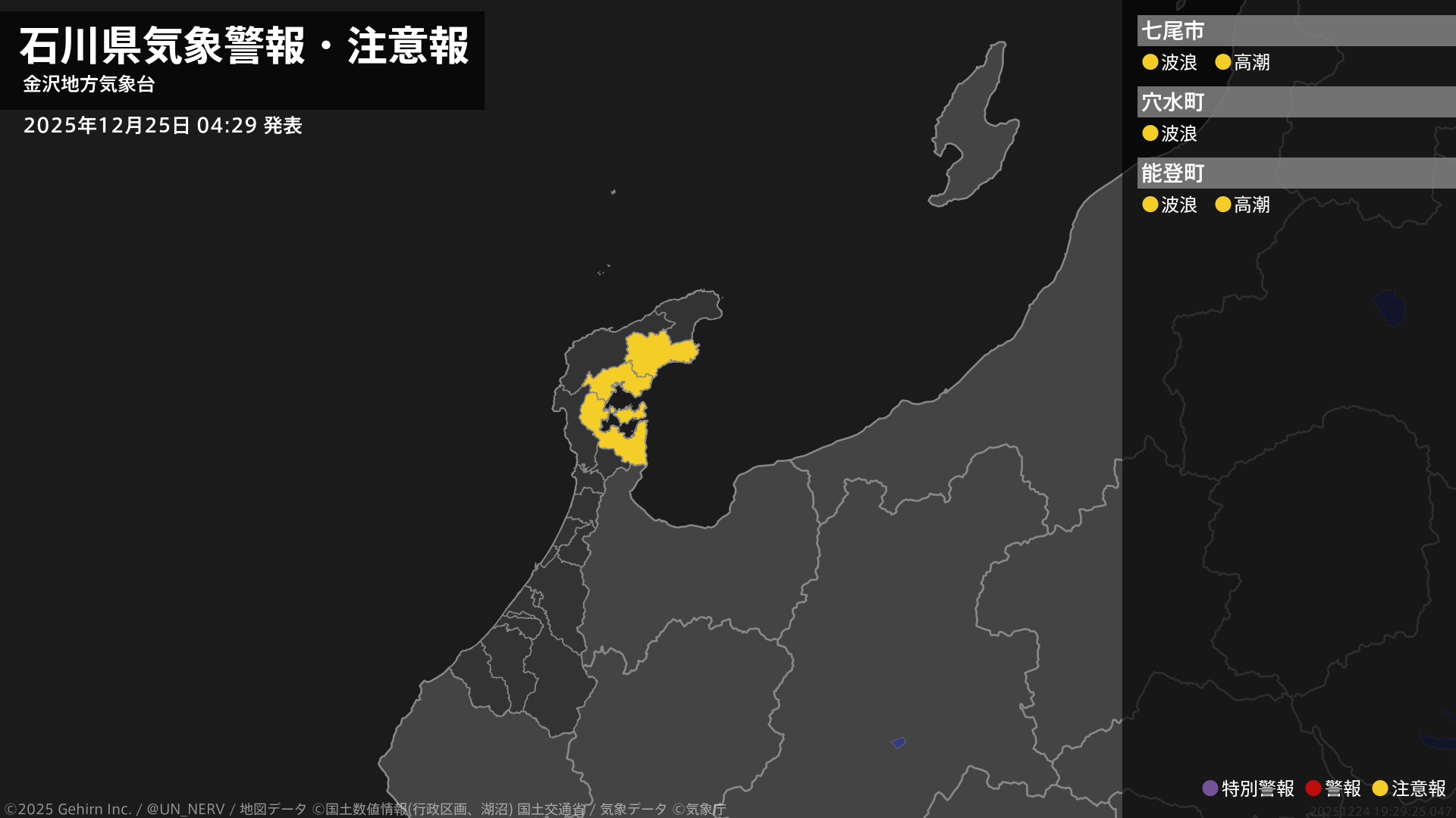 【石川県 気象警報・注意報 2025年12月25日 04:29】能登では、25日朝から高波に、25日朝まで高潮に注意してください。#気象警報注意報 #石川県