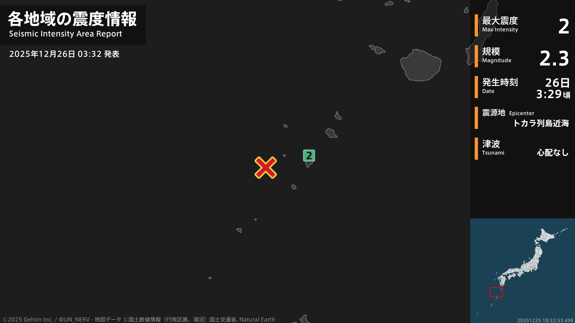 【地震情報 2025年12月26日】3時29分頃、トカラ列島近海を震源とする地震がありました。震源の深さは約10km、地震の規模はM2.3、最大震度2を鹿児島県で観測しています。この地震による津波の心配はありません。#地震 #鹿児島県