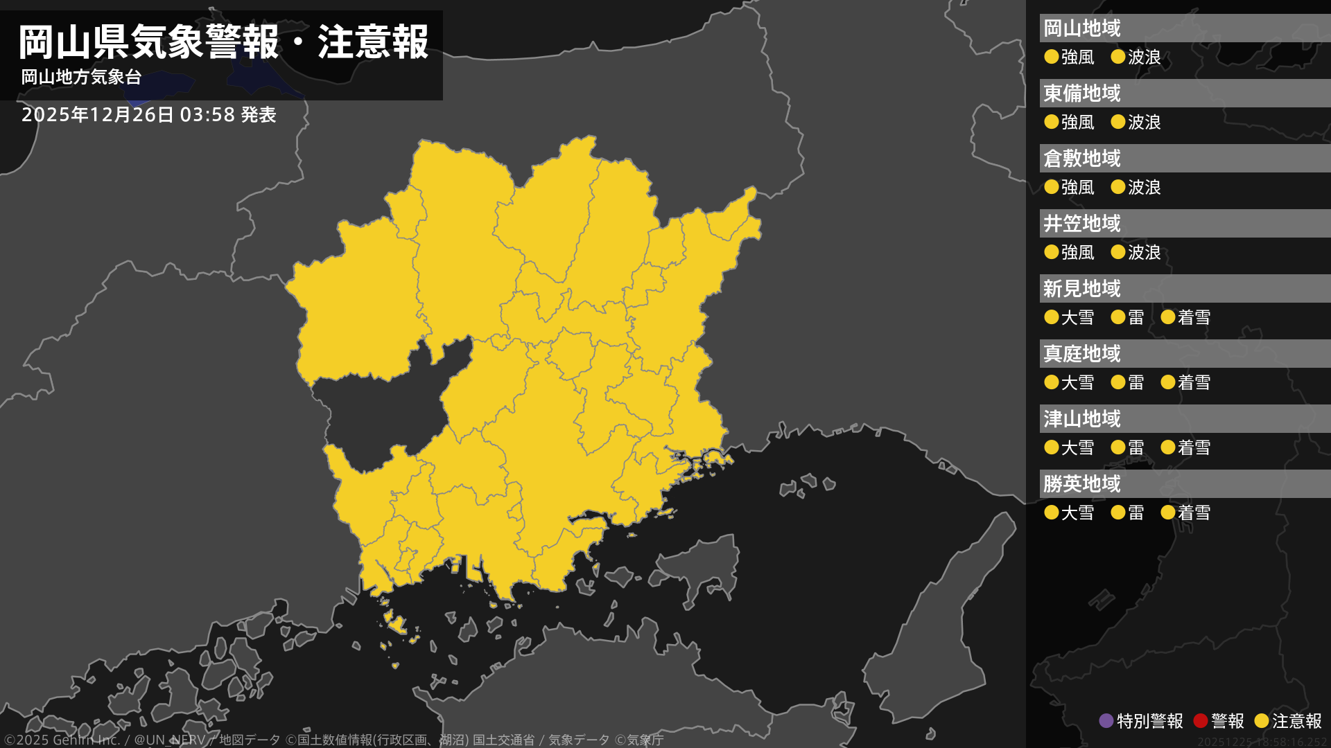【岡山県 気象警報・注意報 2025年12月26日 03:58】南部では、26日夕方まで強風や高波に注意してください。北部では、26日夜のはじめ頃まで大雪や電線等への着雪に、26日夕方まで落雷に注意してください。#気象警報注意報 #岡山県