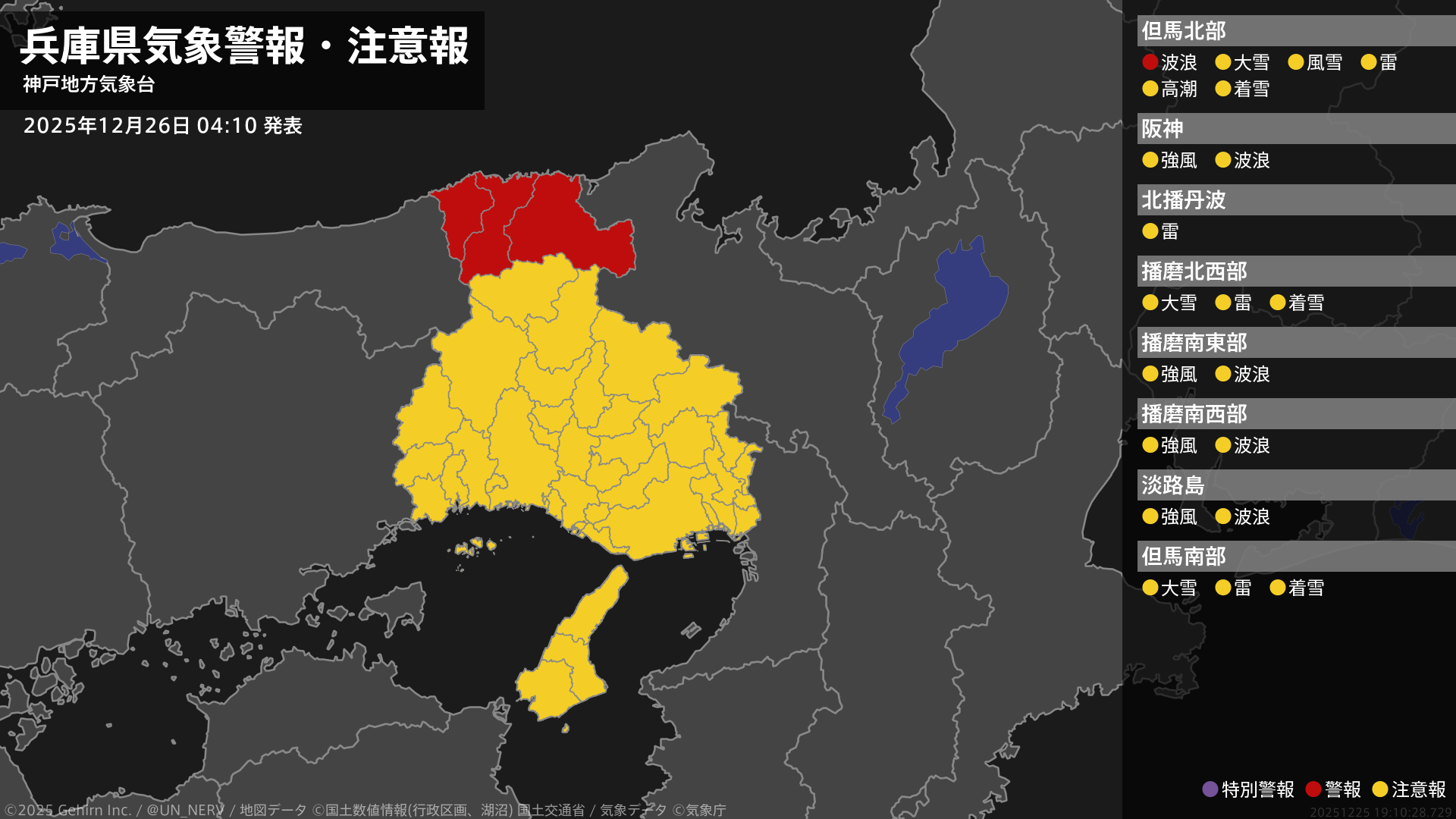 【兵庫県 気象警報・注意報 2025年12月26日 04:10】北部では、26日夕方まで高波に警戒してください。#気象警報注意報 #兵庫県