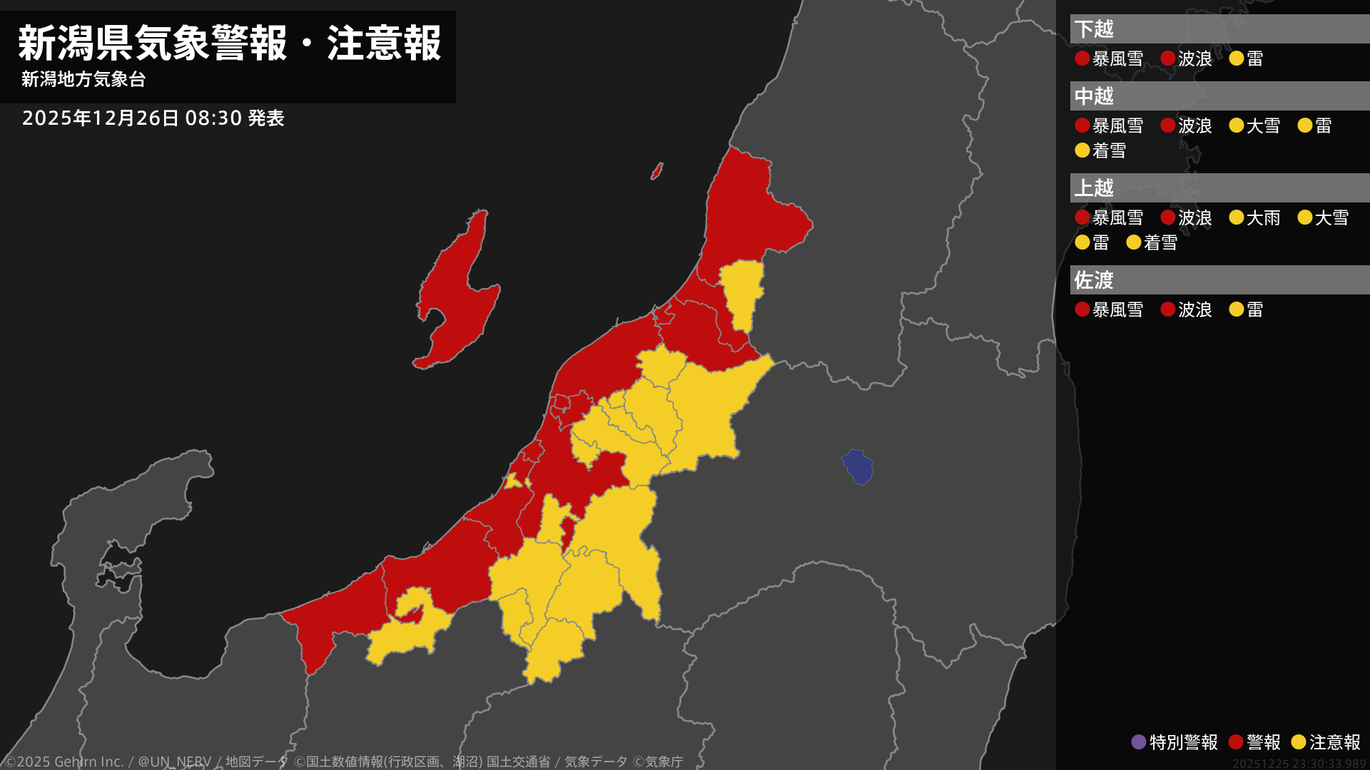 【新潟県 気象警報・注意報 2025年12月26日 08:30】新潟県では、26日昼前まで暴風雪に警戒してください。中越、上越では26日夕方まで、下越、佐渡では27日未明まで、高波に警戒してください。#気象警報注意報 #新潟県