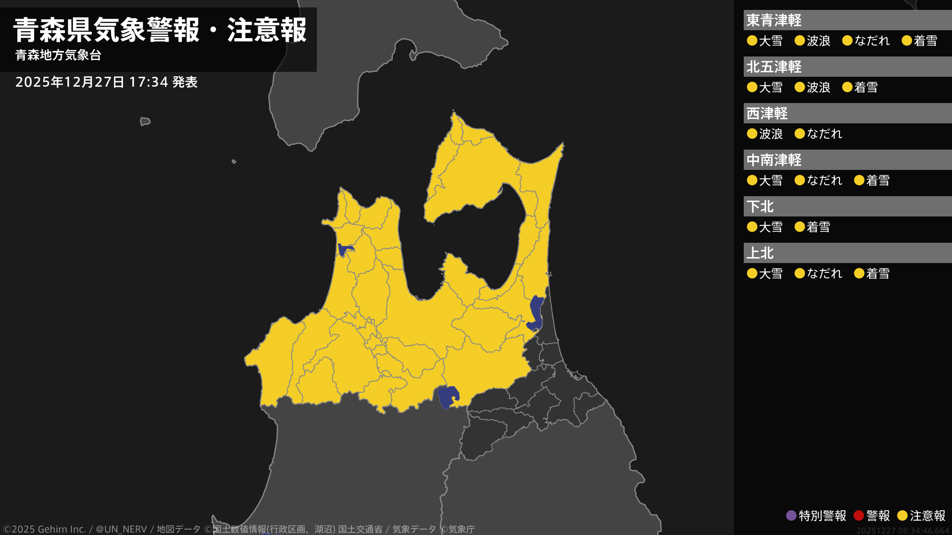 【青森県 気象警報・注意報 2025年12月27日 17:34】