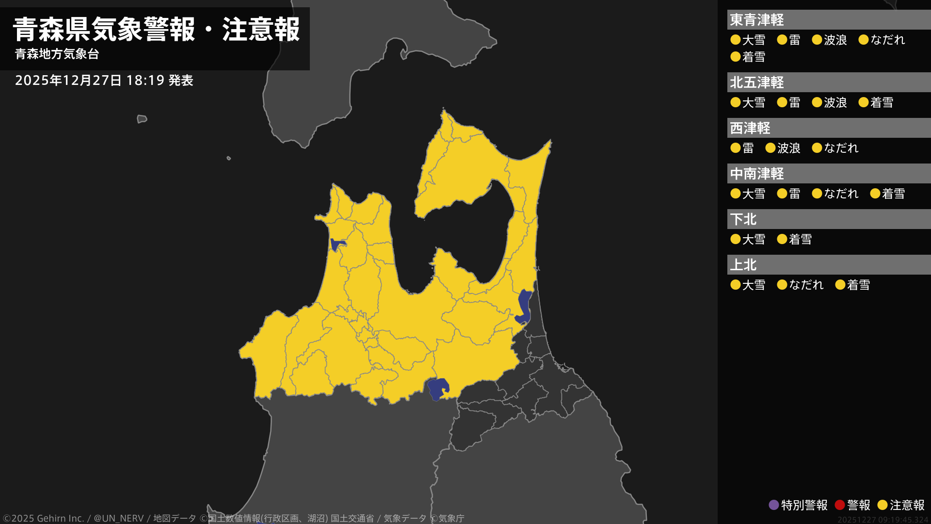 【青森県 気象警報・注意報 2025年12月27日 18:19】