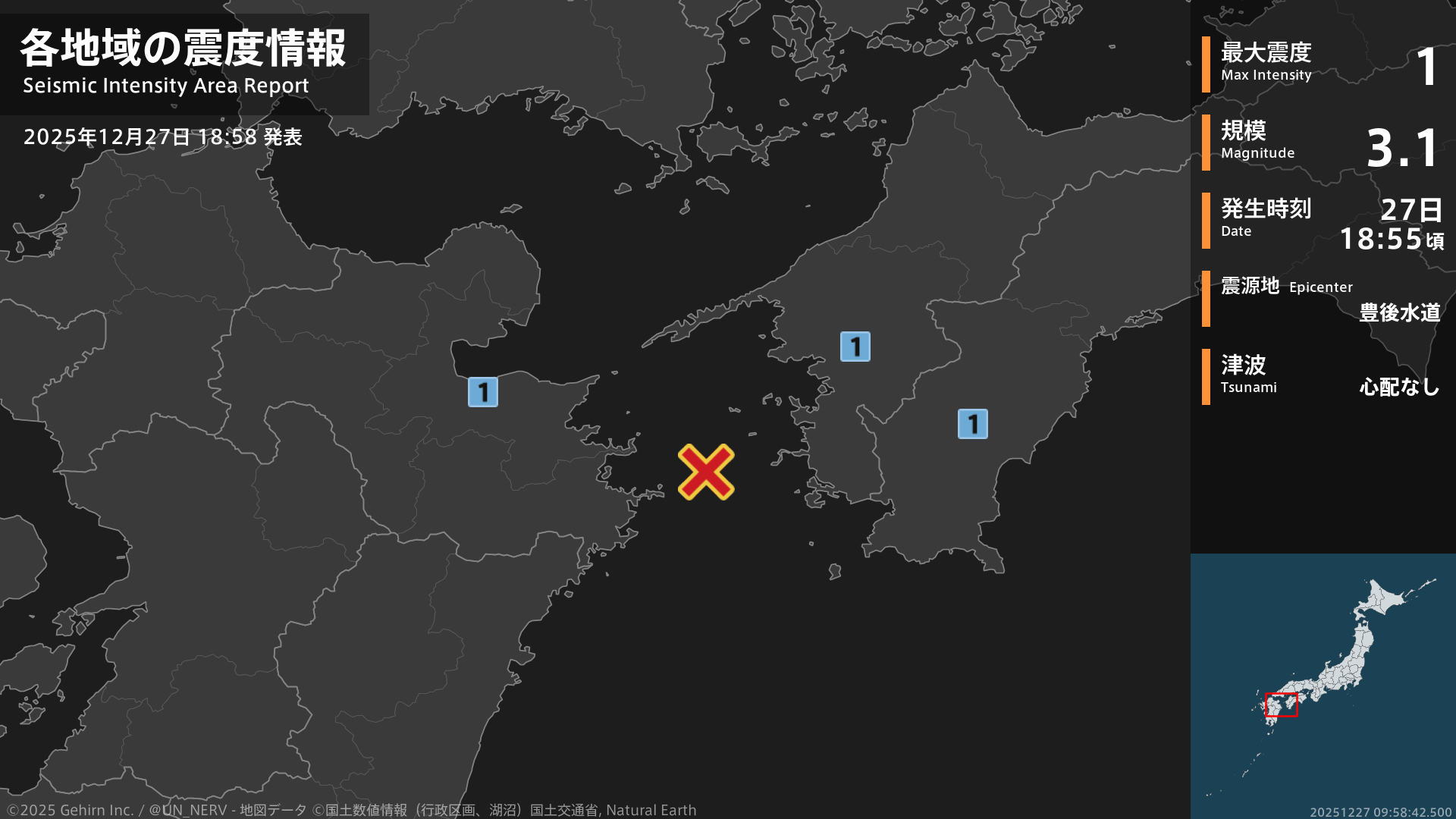 18時55分頃、豊後水道を震源とする地震がありました。震源の深さは約40km、地震の規模はM3.1、最大震度1を愛媛県、高知県、大分県で観測しています。この地震による津波の心配はありません。