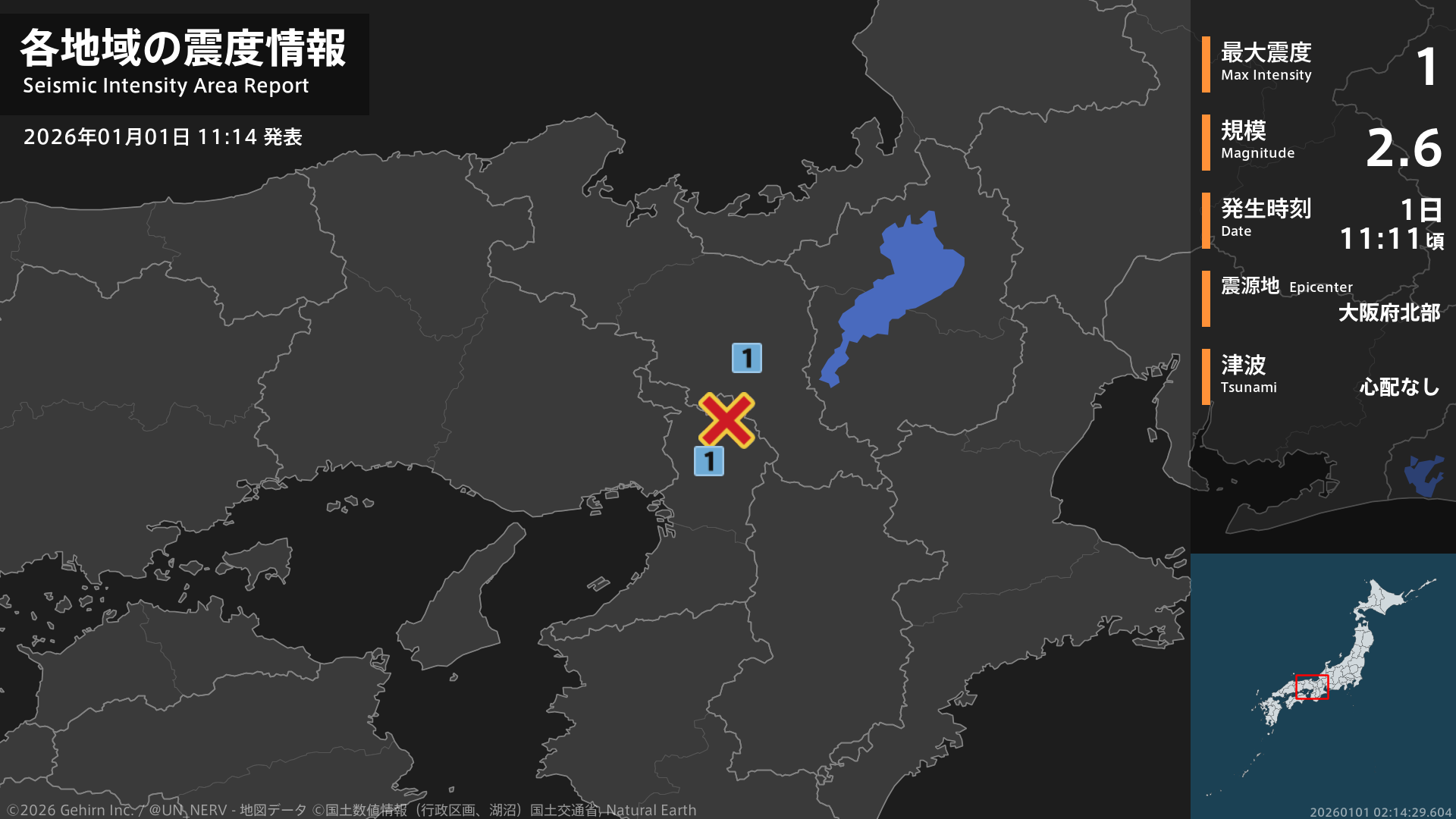 【地震情報 2026年1月1日】11時11分頃、大阪府北部を震源とする地震がありました。震源の深さは約20km、地震の規模はM2.6、最大震度1を京都府、大阪府で観測しています。この地震による津波の心配はありません。#地震 #京都府 #大阪府