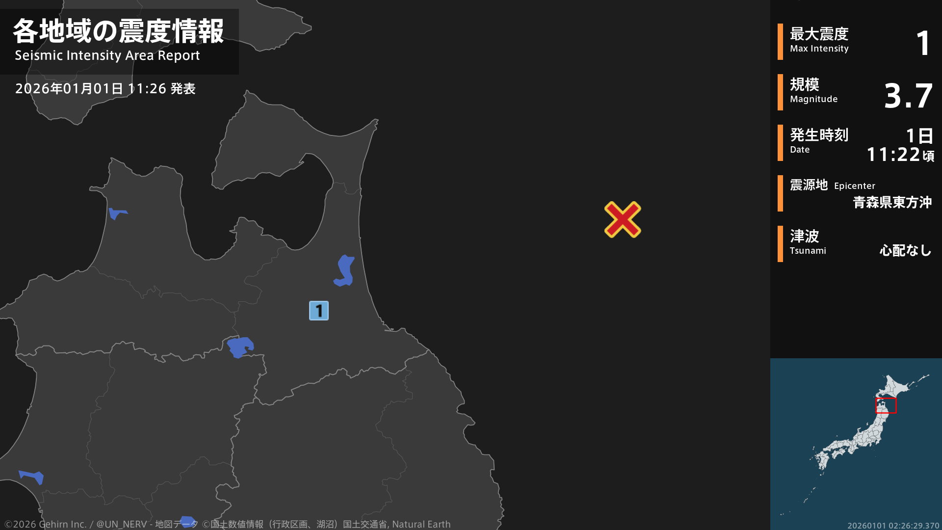 【地震情報 2026年1月1日】11時22分頃、青森県東方沖を震源とする地震がありました。震源の深さは約40km、地震の規模はM3.7、最大震度1を青森県で観測しています。この地震による津波の心配はありません。#地震 #青森県
