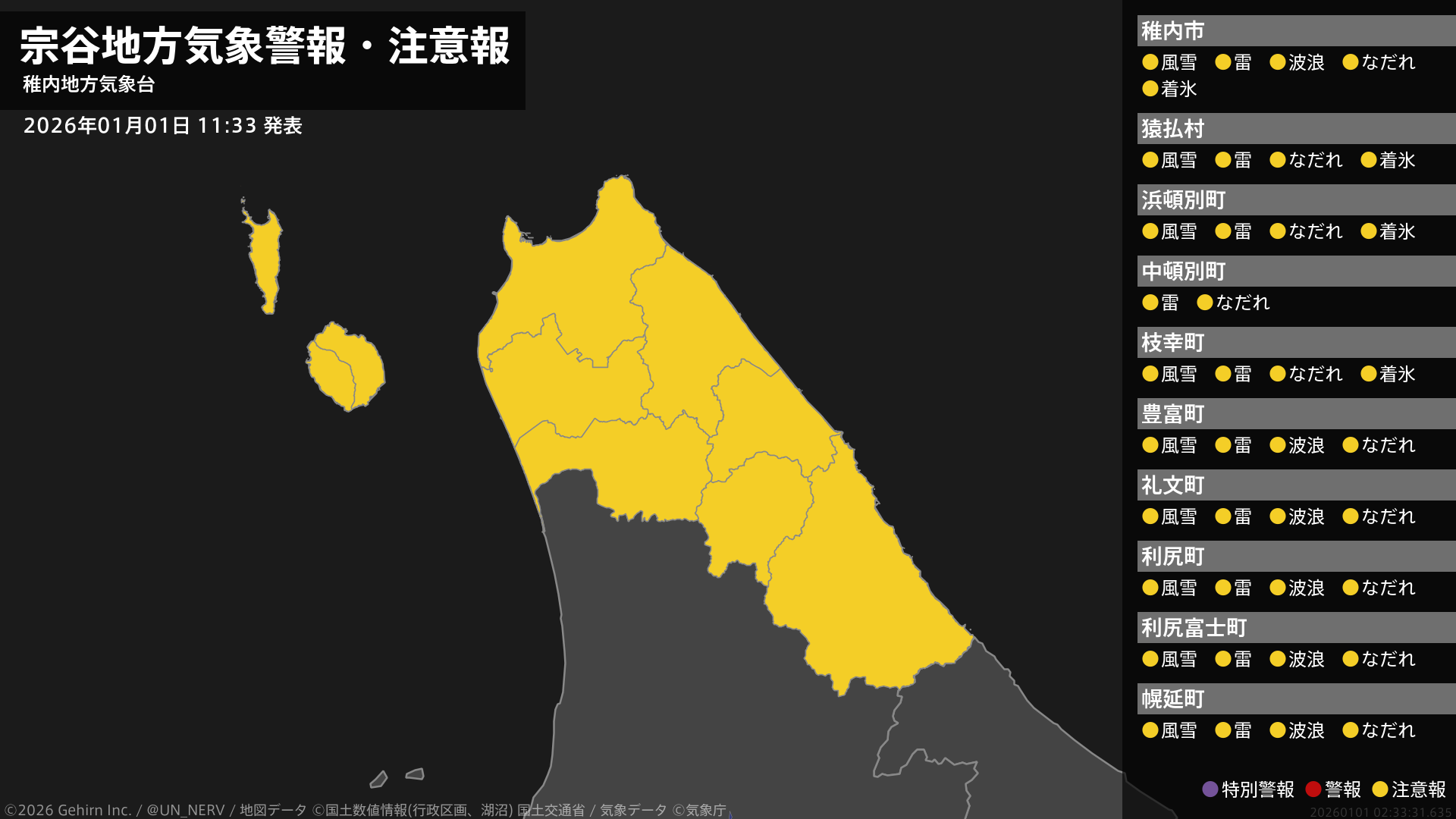 【宗谷地方 気象警報・注意報 2026年01月01日 11:33】宗谷地方では、風雪や高波、竜巻などの激しい突風、落雷、なだれ、着氷に注意してください。#気象警報注意報 #宗谷地方