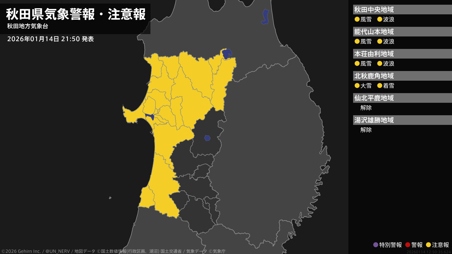 【秋田県 気象警報・注意報 2026年01月14日 21:50】沿岸では、風雪や高波に注意してください。内陸では、大雪や電線等への着雪に注意してください。#気象警報注意報 #秋田県